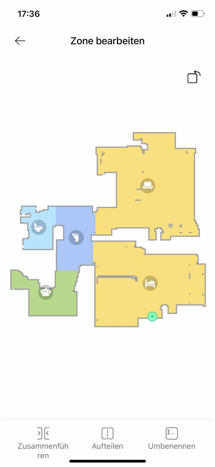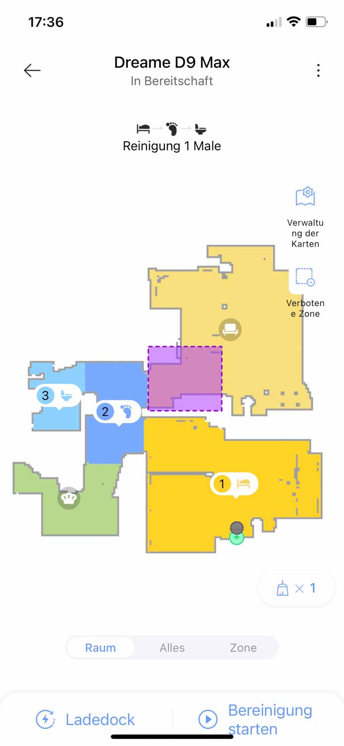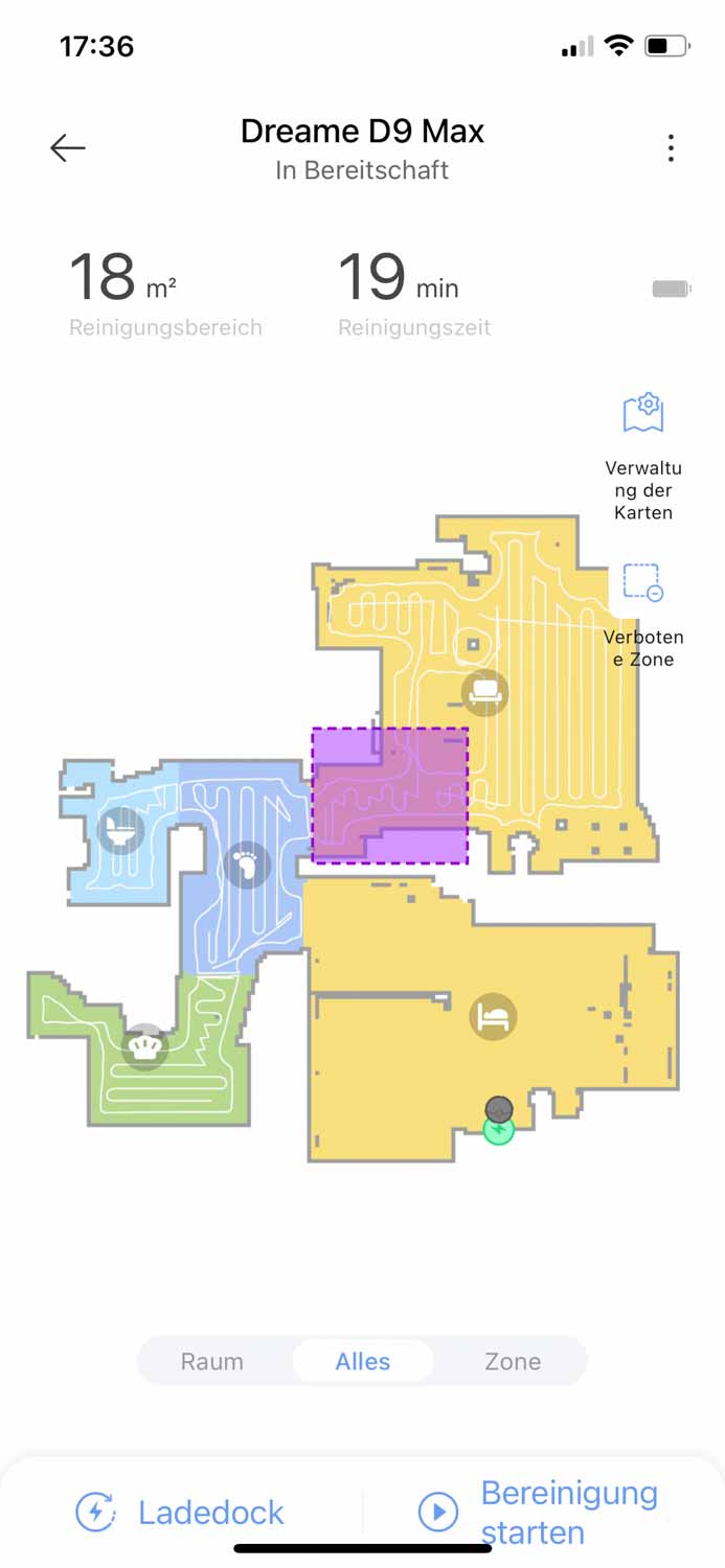 Bei der ersten Reinigung des Dreame D9 Max erstellt dieser automatisch eine detaillierte Karte eures Grundrisses. Diese Karte teilt er automatisch in Räume auf, was im Test funktionierte. Die einzelnen Räume sind natürlich manuell anpassbar und können individuell benannt werden. Nun kann man mit der Karte interagieren und per Druck auf einzelne Räume den Roboter diese reinigen lassen. Man kann natürlich auch eine vollständige Reinigung durchführen oder den Roboter in selbst eingezeichnete Zonen zum Reinigen schicken. Das Erstellen von mehreren Karten oder Etagen ist selbstverständlich eine Option.