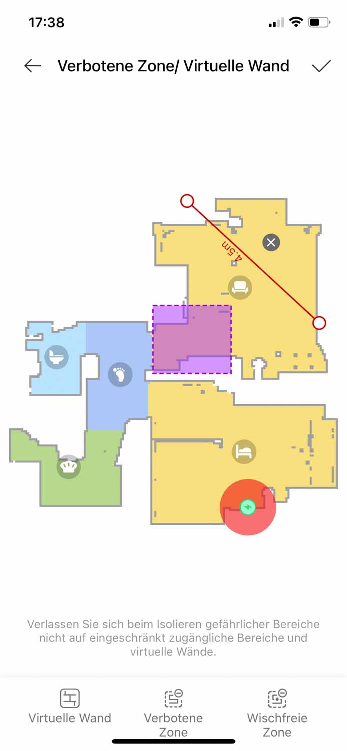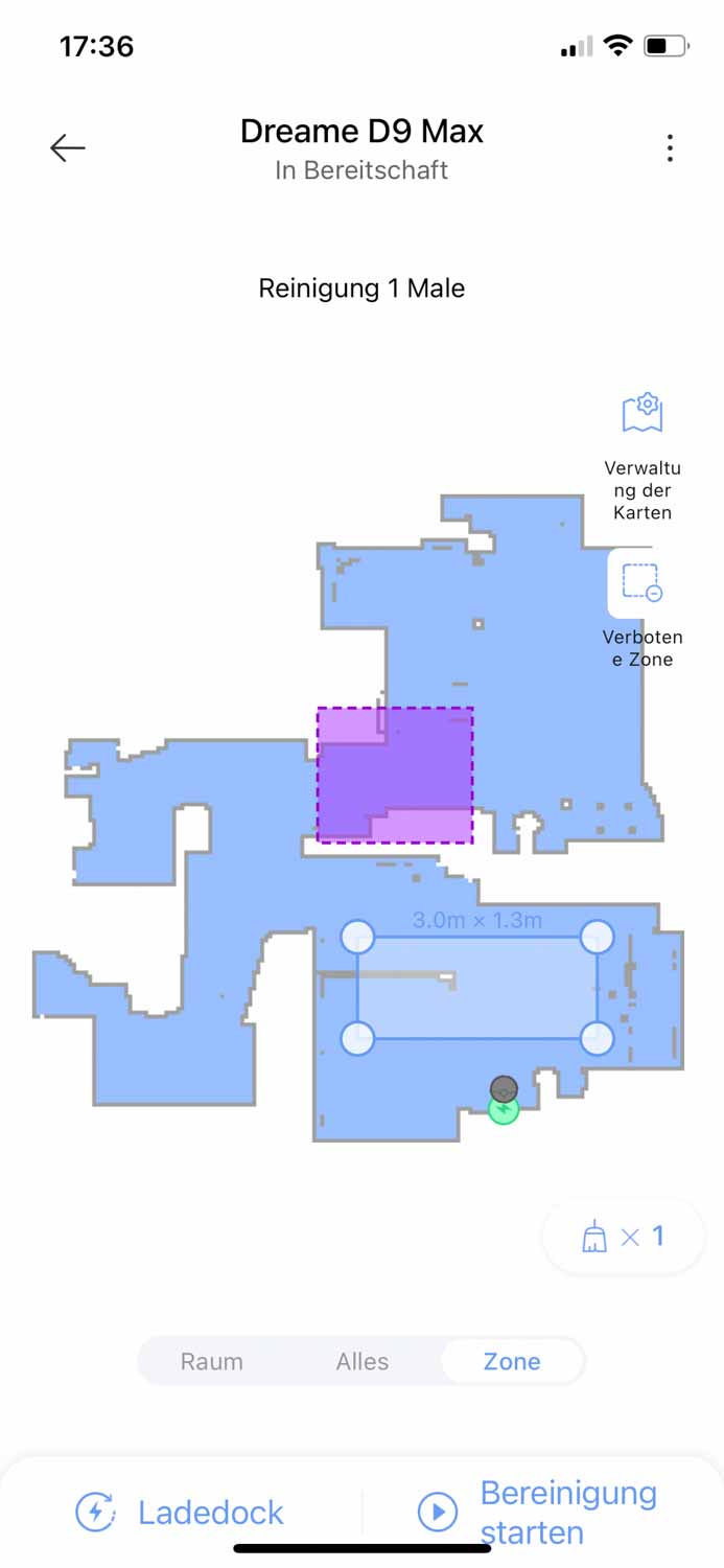 Es ist möglich, auf der erstellten Karte bestimmte Sperrbereiche für den Dreame D9 Max einzuzeichnen. Diese verhindern in zukünftigen Reinigungen das Befahren dieser Stellen. Dabei kann man unterscheiden, ob der Roboter diese komplett meiden soll oder ob er dort nur nicht wischen darf. Wer einen Teppich zu Hause liegen hat, der sollte so eine Nicht-Wischzone auf diesen legen. In der Praxis hat das beim Dreame D9 Max tadellos funktioniert.