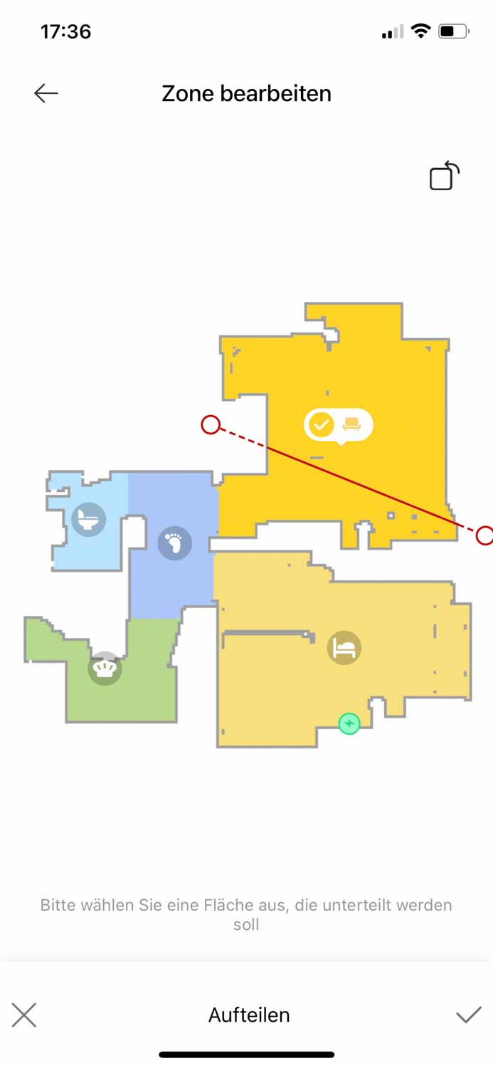 Das Erstellen eines Zeitplans ist eine tolle Funktion, die es erlaubt, den Roboter zu einer individuell ausgewählten Uhrzeit zu starten. Dabei kann man auswählen, ob der Roboter alles oder nur bestimmte Räume reinigen soll, um wie viel Uhr er das tun soll und an welchen Tagen die Reinigung stattfinden soll. Die Saug- und Wischleistung ist davor einzustellen, kann jedoch nicht für einzelne Räume anders aufgestellt werden.