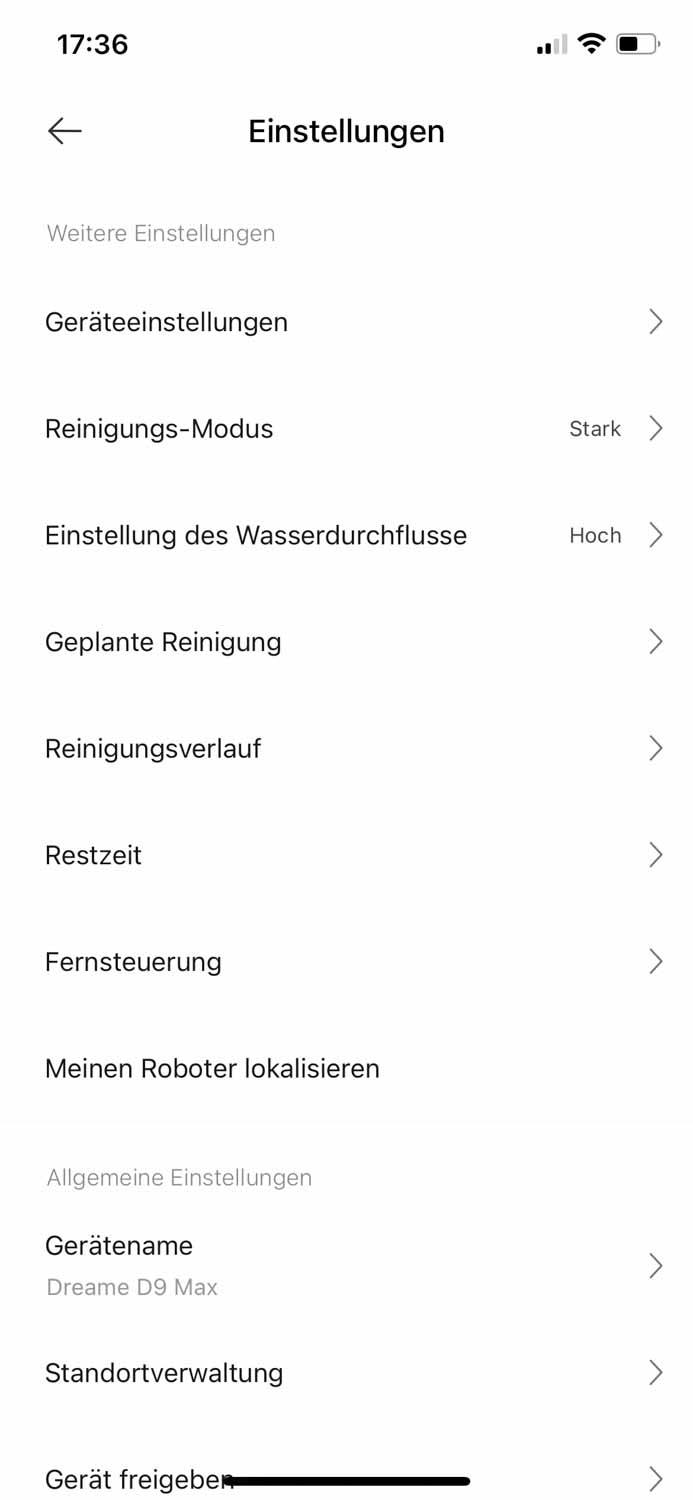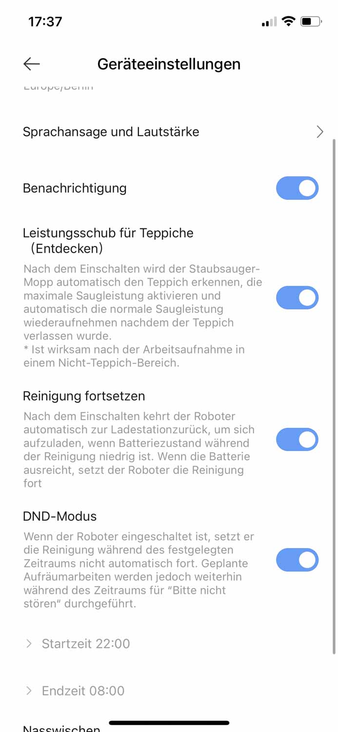 Jeder Roboter besitzt inzwischen verschiedene Grundeinstellungen, die einmalig festgelegt werden können. Dabei handelt es sich beispielsweise um das Einstellen der Leistungssteigerung auf Teppichboden oder um die Wiederaufnahme der Reinigung nach leer gegangenem Akku. Ein Nicht-Stören-Modus, der zu bestimmten Zeiten startet und endet, verhindert die Sprachausgabe und dimmt das Licht der Knöpfe auf dem Roboter. Der Dreame D9 Max spricht selbstverständlich auch Deutsch.