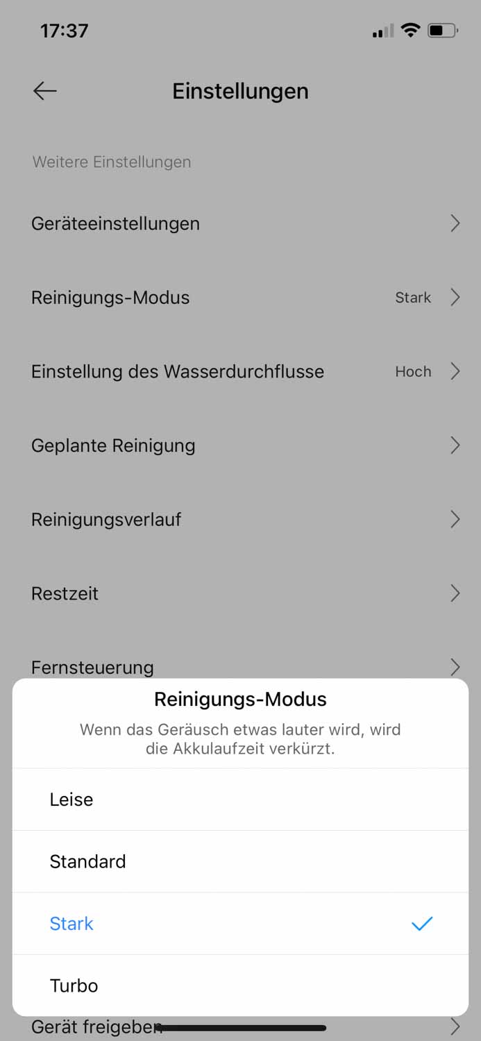 Es ist möglich, vor oder während der Reinigung die Saugstufe, die Wischleistung und die Reihenfolge der zu reinigenden Räume einzustellen. Bei einer vollständigen Reinigung kann der Dreame D9 Max im Test jedoch nur einmal alles abfahren. Ausgewählte Räume hingegen kann er auch zwei oder dreimal reinigen. Die Saugleistung ist in vier Stufen und die Wischleistung in drei Stufen einstellbar. Leider ist es nicht möglich, einzelne Räume in der Leistung zu individualisieren. Entweder alles oder nichts. Eben genauso wie beim Dreame D9.
