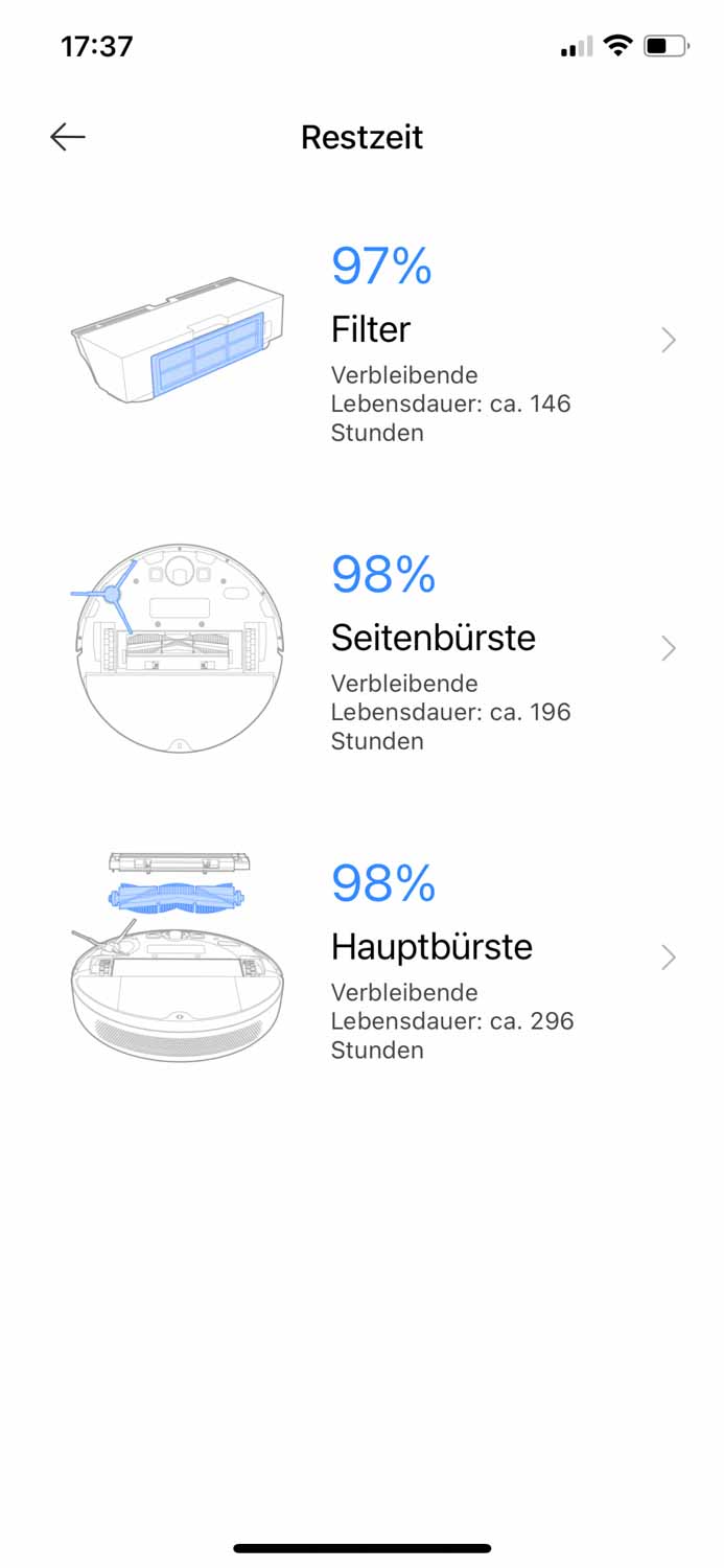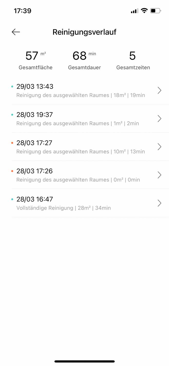 Abzurufen ist eine Ansicht, die zeigt, wann die letzten Reinigungen vonstattengingen. Wann die Verschleißteile den Geist aufgeben und sie gewechselt werden müssen, ist ebenfalls einsehbar. Die App enthält eine Fernsteuerung für den Dreame D9 Max, die den Roboter manuell durch die Wohnung lenken lassen kann. Das ist vorwiegend dann praktisch, wenn der Roboter sich festgefahren hat.