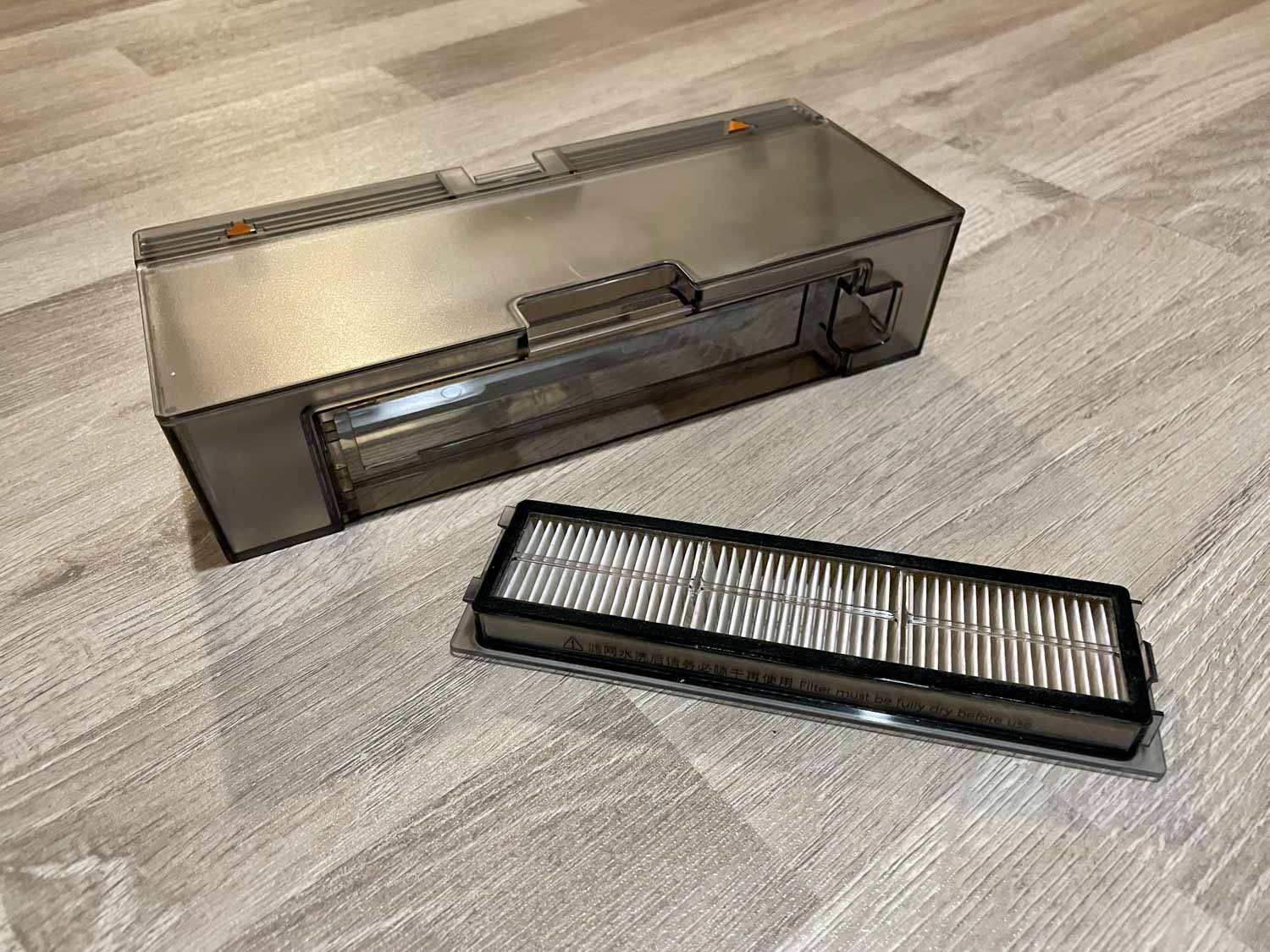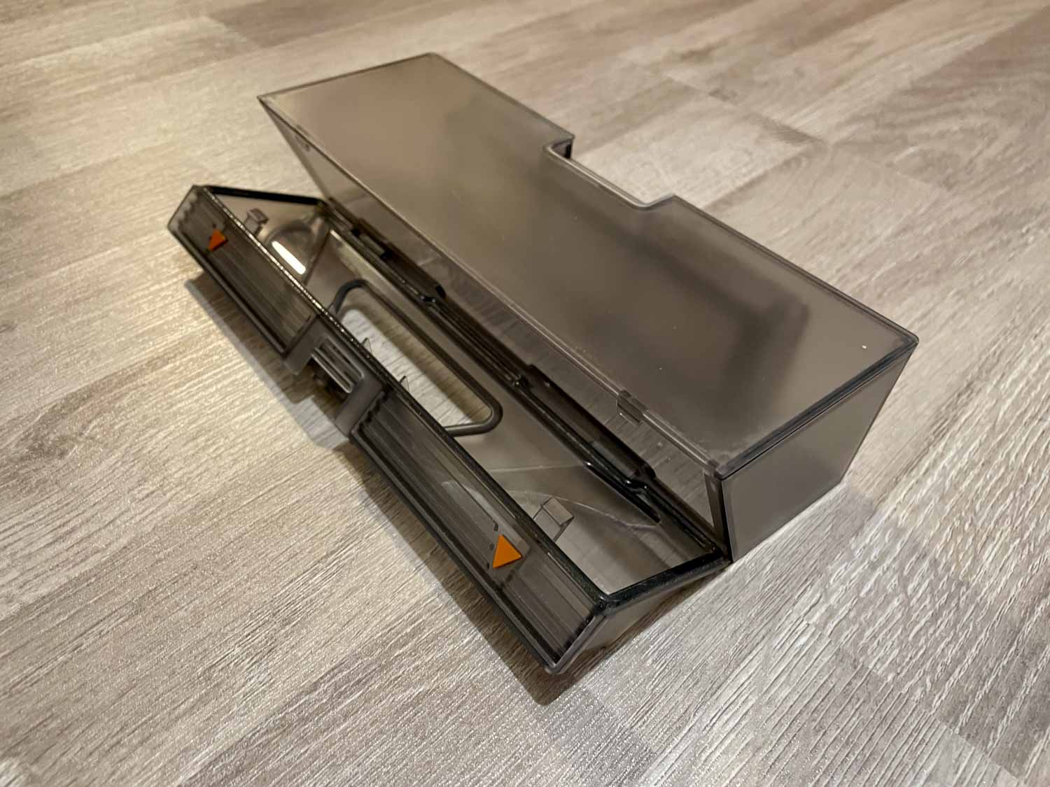Der dunkel, transparente und längliche Staubbehälter des Dreame D9 Max fast überdurchschnittliche 570 ml und besitzt einen Feinstaubfilter, der diesen mal nicht mehr, wie beim Dreame D9, mit einem zusätzlichen Gitter vor groben Schmutz geschützt ist. Er lässt sich einfach von vorne aufklappen und komfortabel entleeren. Eine Rückschlagklappe besitzt dieser jedoch nicht.