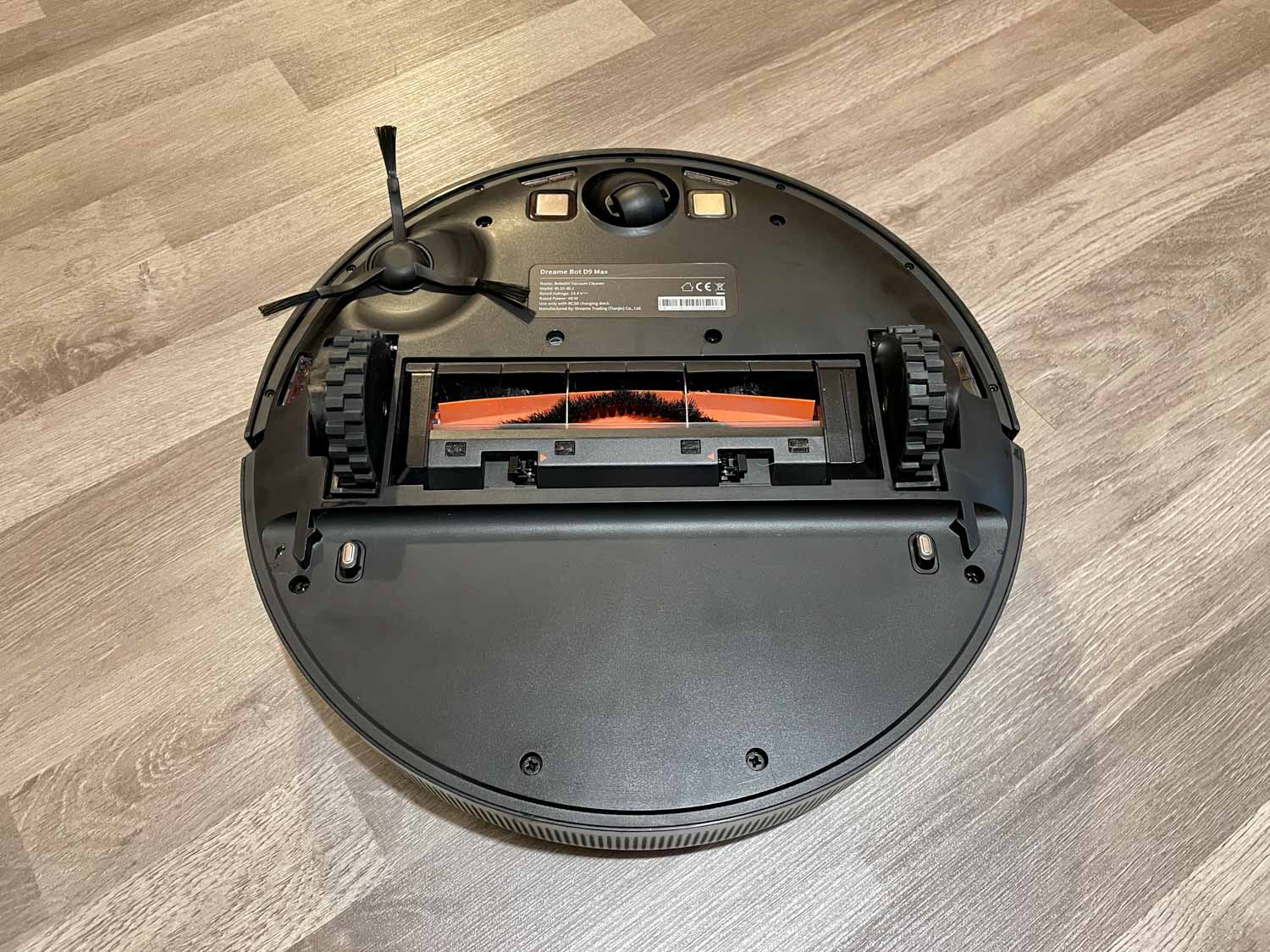 Neben zwei großen Rädern und den vorn positionierten Ladekontakten, findet man ganze sechs Absturzsensoren entlang des Randes, die den Roboter daran hindert, Abgründe hinabzustürzen. Die Hauptbürste sieht wieder ganz nach Roborock aus, passt jedoch von ihrer Länge nicht ganz in diese. Mit Bürsten und Lamellen versehen, ist sie ideal für die Bodenreinigung konzipiert. Zum Reinigen lässt diese sich natürlich entnehmen. Der Dreame D9 Max besitzt leider nur eine einzige Seitenbürste, die jedoch praktisch aufgesteckt und wieder abgezogen werden kann.