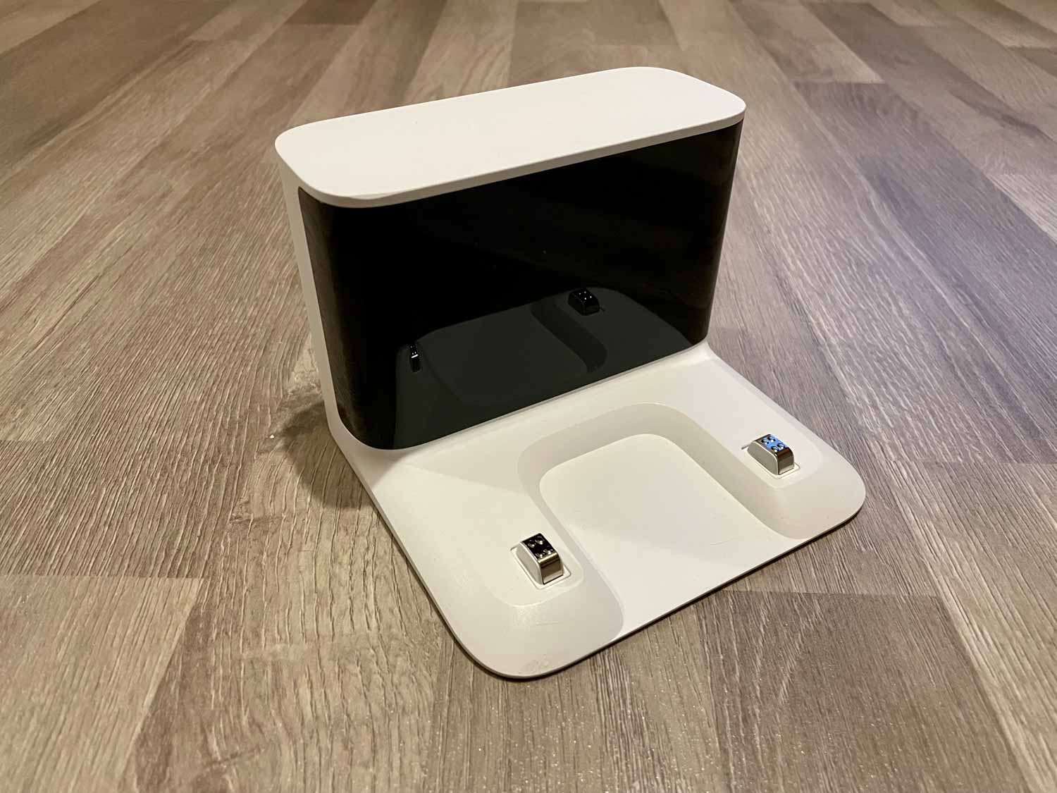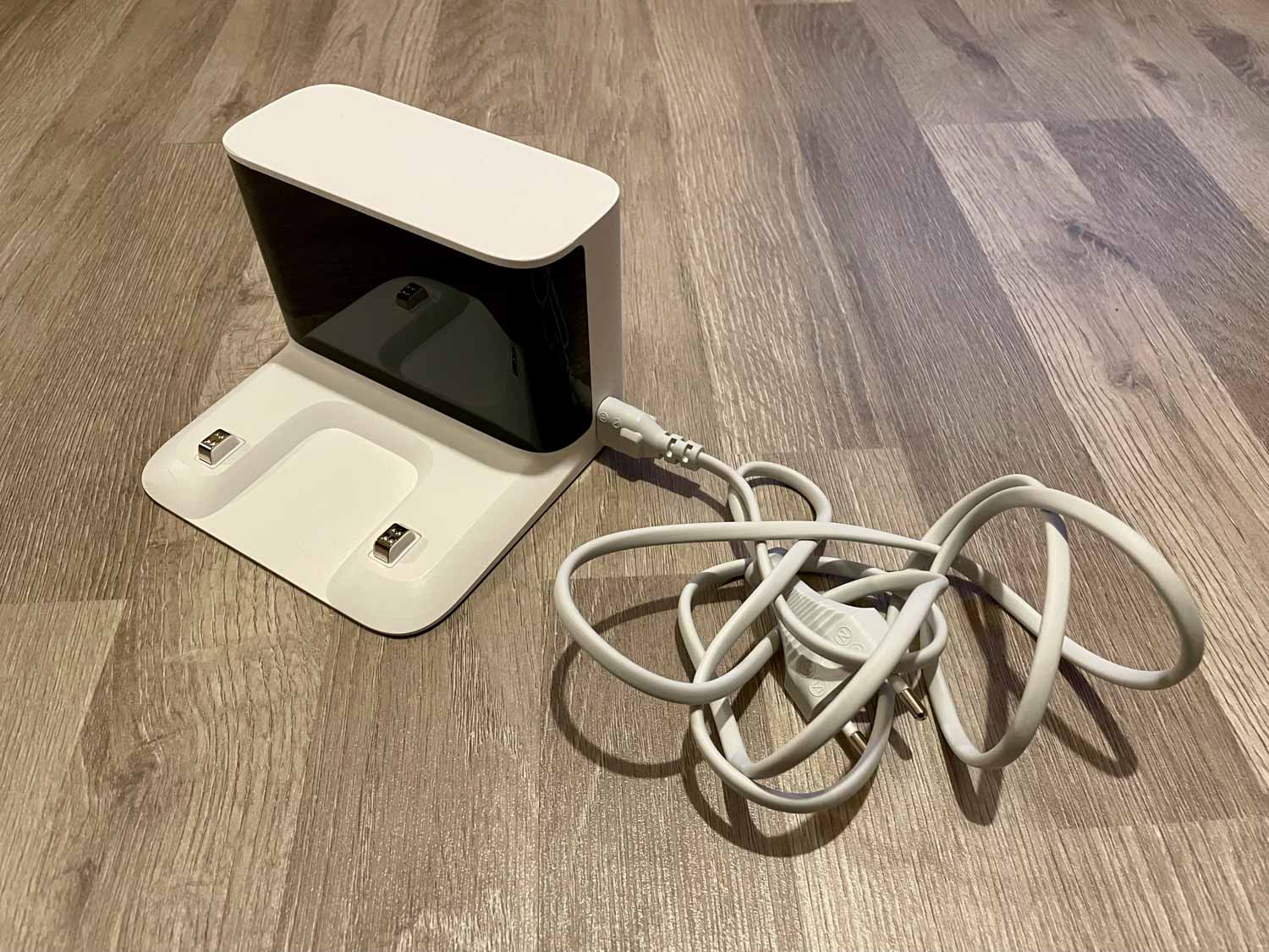 Die Ladestation ist minimalistisch aber gut verarbeitet und klein. Durch kleine Ladekontakte fließt der Strom in den Roboter. Sie besitzt leider kein Kabelmanagement, das Kabelsalat verhindern könnte. Das mitgelieferte EU-Netzkabel lässt sich auf der rechten Seite einstecken.