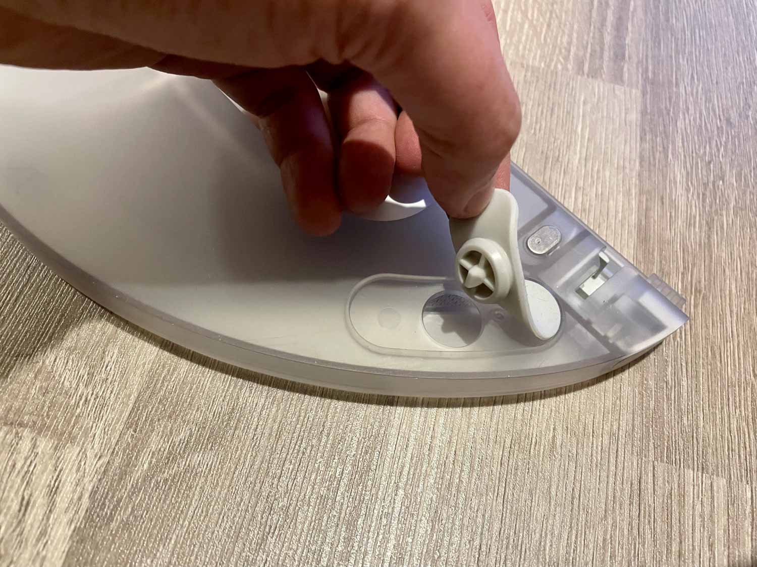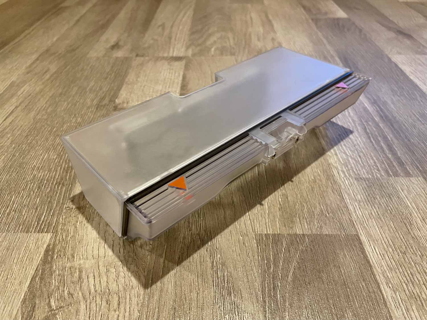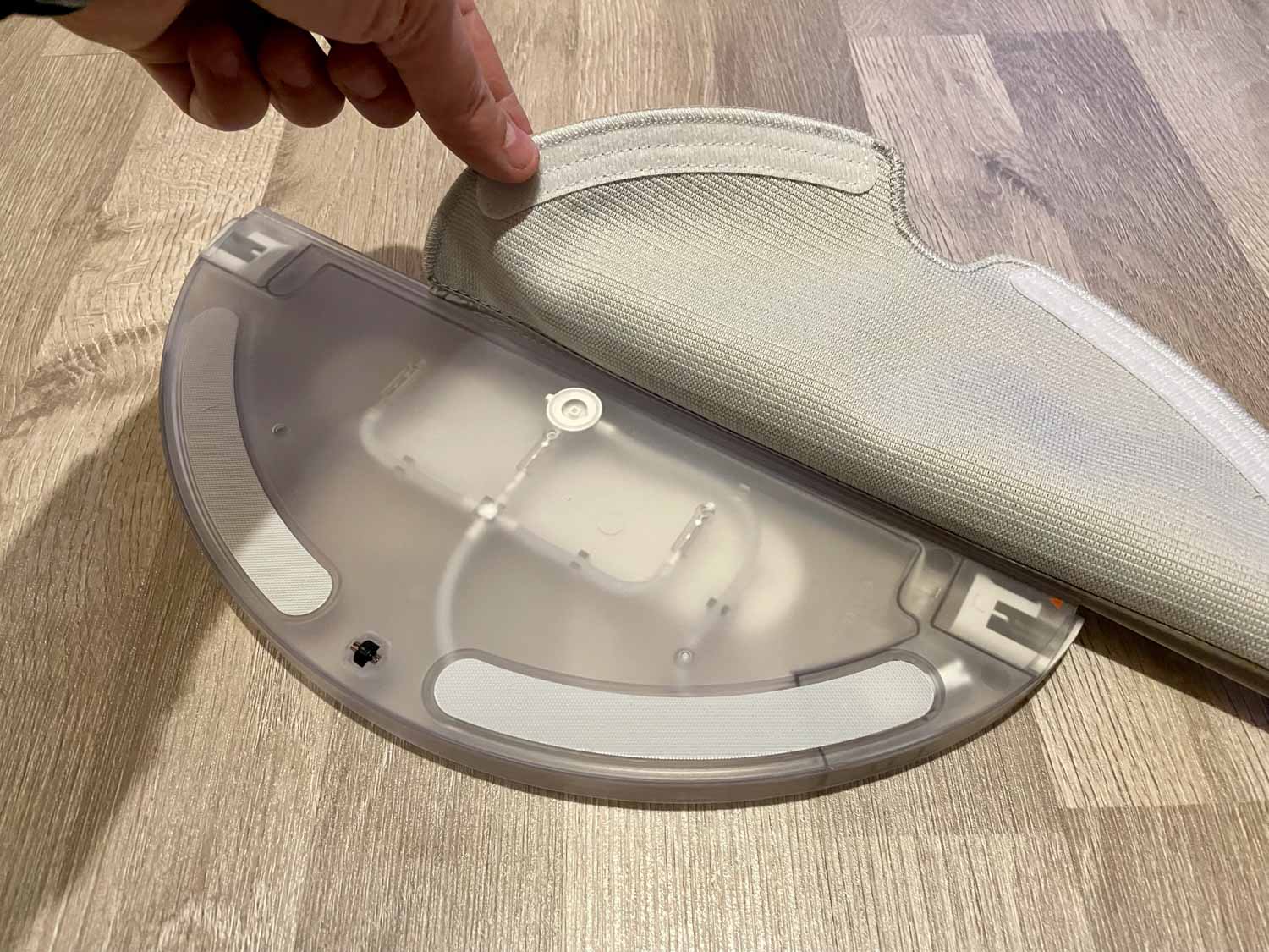 Der ebenfalls transparente Wassertank fasst nur 240 ml Wasser und ist somit relativ klein bemessen. Er lässt sich elektronisch über die App steuern, was das Wischen auf allen Hartbodenarten zulässt. Er lässt sich über eine graue Gummiabdichtung befüllen und gibt das Wasser aus drei Düsen auf das Wischtuch ab. Dieses Mikrofaserwischtuch wird von der Seite her auf die Wischplatte aufgezogen und dessen Wischfläche geht über die ganze Wassertankbreite. Bei den Roborocks ist die Wischfläche oft nur mittig ausgelegt. Ein kleines zusätzliches Rad am Heck des Wassertanks verhindert das Schleifen auf dem Boden bei hohen Überfahrten.