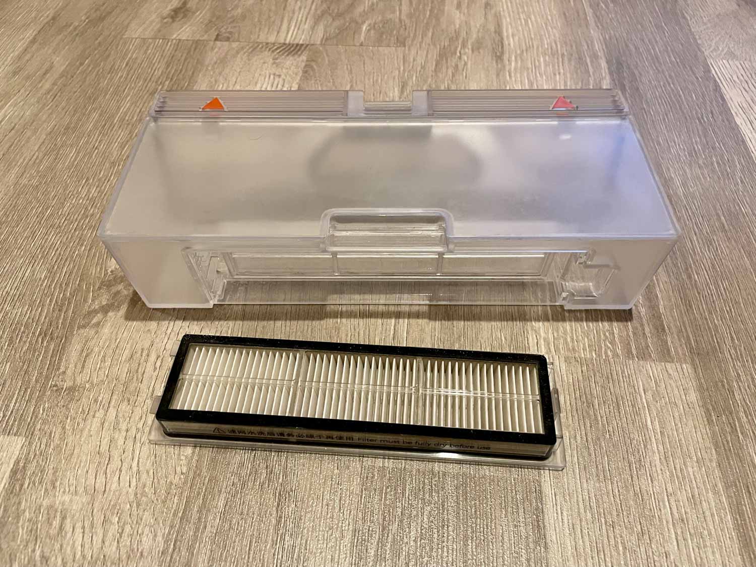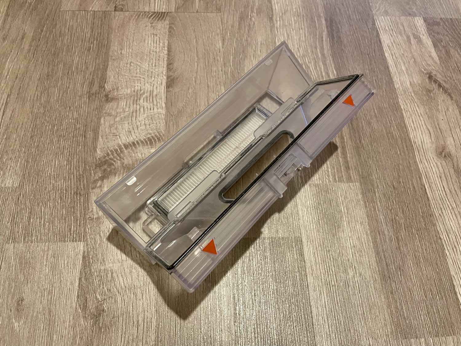 Der voluminöse, transparente und längliche Staubbehälter des Dreame D9 fasst überdurchschnittliche 570 ml und besitzt einen Feinstaubfilter, der mit einem feinen Gitter vor groben Schmutz geschützt ist. Er lässt sich einfach von vorne aufklappen und komfortabel entleeren. Eine Rückschlagklappe besitzt dieser jedoch nicht.