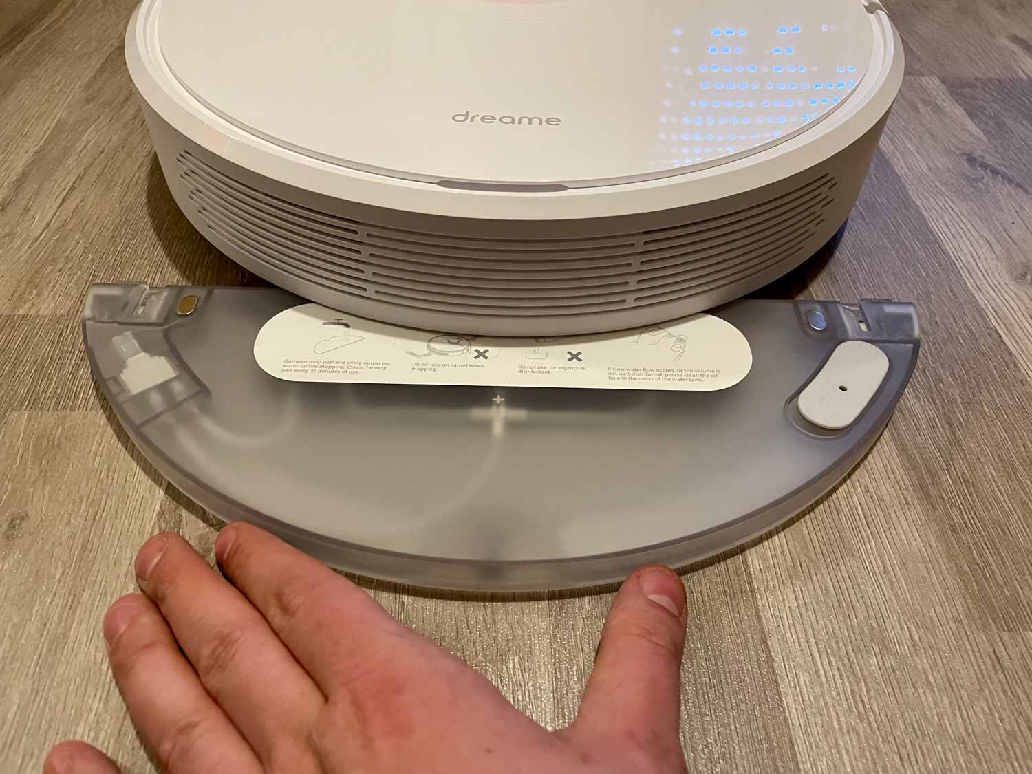 - Der Wassertank lässt sich einfach unter den Dreame D9 schieben