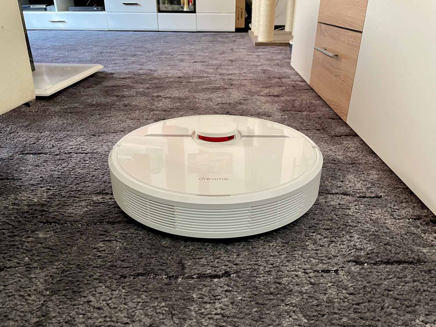 Durch die automatische Maximalstellung der Saugleistung, sobald der Roboter Teppichboden überfährt, schafft er auch diesen einwandfrei von Schmutz zu befreien. Die Teppicherkennung wird allein über den Widerstand auf die Bürste erkannt, was bei ihm blitzschnell erfolgte. Seine Saugkraft scheint sogar so stark zu sein, dass er eingesaugten Schmutz regelrecht an den innenliegenden Filter drückt. Ich bin mit der Saugleistung des Dreame D9 sehr zufrieden. Er kommt damit an die leistungsstarke Konkurrenz heran oder übertrumpft diese sogar.