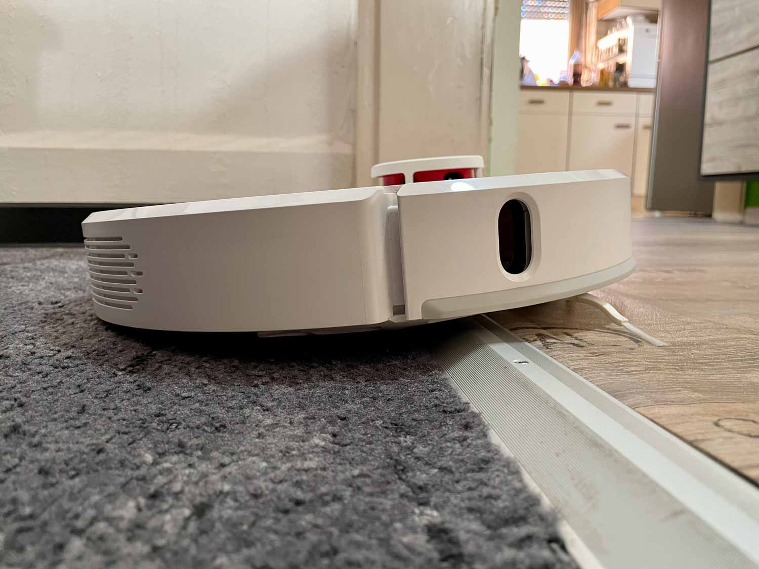 Der Dreame D9 schaffte es im Test, eine 2,1 cm Hürde zu überwinden. Der Durchschnitt liegt hier bei 2 cm. Somit stellt er sich als wahrer Kletterkünstler heraus. Durch seine Infrarotsensoren im Bumper verringert er seine Geschwindigkeit vor Möbeln oder Wänden und verhindert damit eine zu dolle Auffahrt auf diese. Zwar dockt er sie mit seinem Bumper immer an, das jedoch sehr vorsichtig. Eine optische Erkennung von Hindernissen hat er nicht verbaut bekommen und so kann es schon mal vorkommen, dass flache Gegenstände wie Socken, Kabel oder Ähnliches von ihm verschluckt werden können. Größere aber leichte Gegenstände schiebt er einfach zur Seite und umfährt diese nicht. Bei einem so günstigen Preis ist dies jedoch zu verschmerzen.