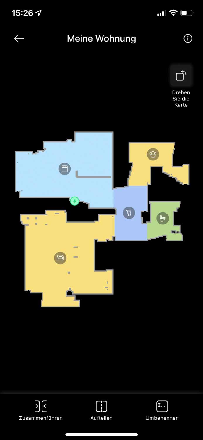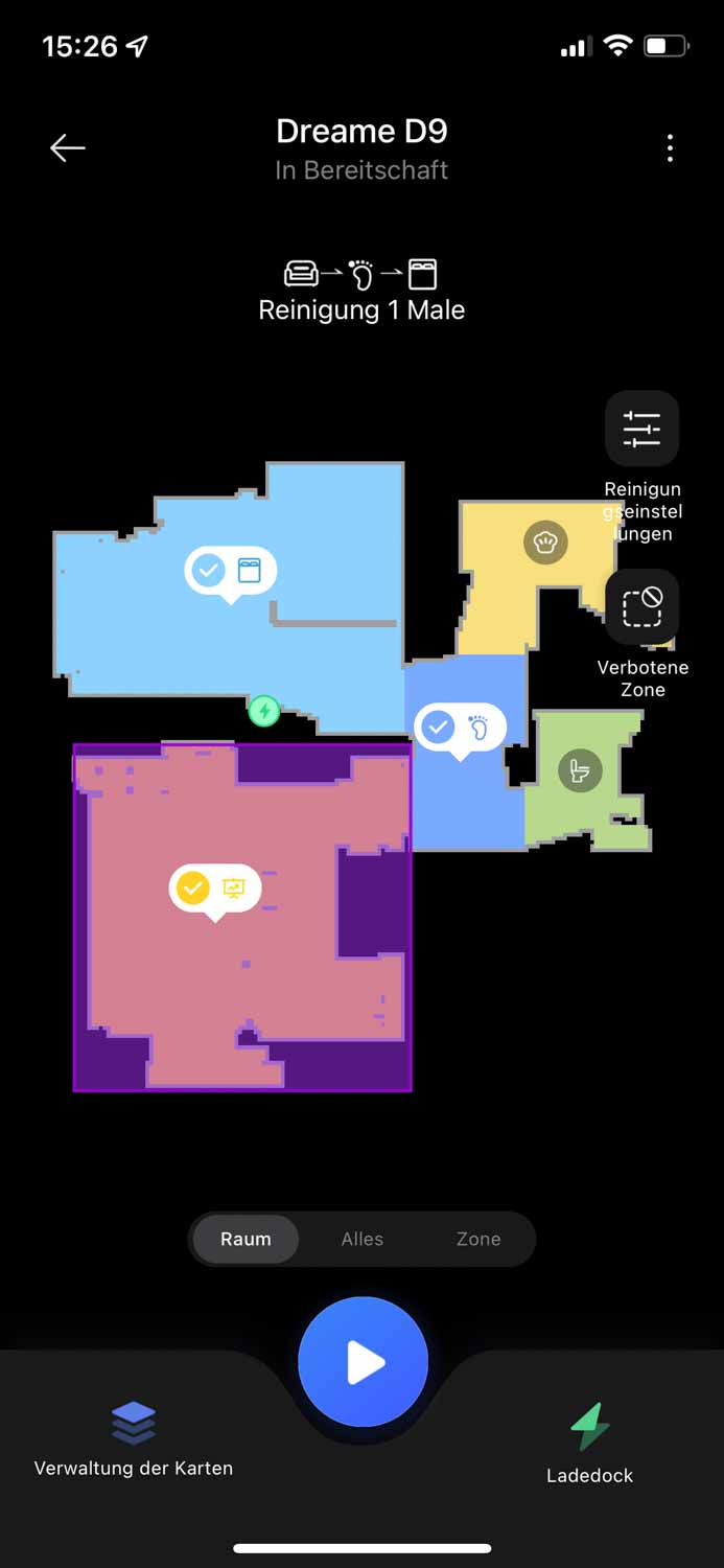 Bei der ersten Reinigung des Dreame D9, erstellt dieser automatisch eine detaillierte Karte eures Grundrisses. Diese Karte teilt er automatisch in Räume auf, was im Test perfekt klappte. Die einzelnen Räume sind natürlich manuell anpassbar und können individuell benannt werden. Nun kann man mit der Karte interagieren und per Druck auf einzelne Räume, den Roboter diese reinigen lassen. Man kann natürlich auch eine vollständige Reinigung durchführen oder den Roboter in selbst eingezeichnete Zonen zum Reinigen schicken. Das Erstellen von mehreren Karten oder Etagen ist natürlich eine Option.