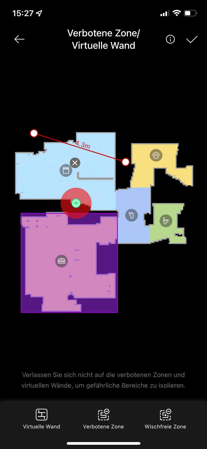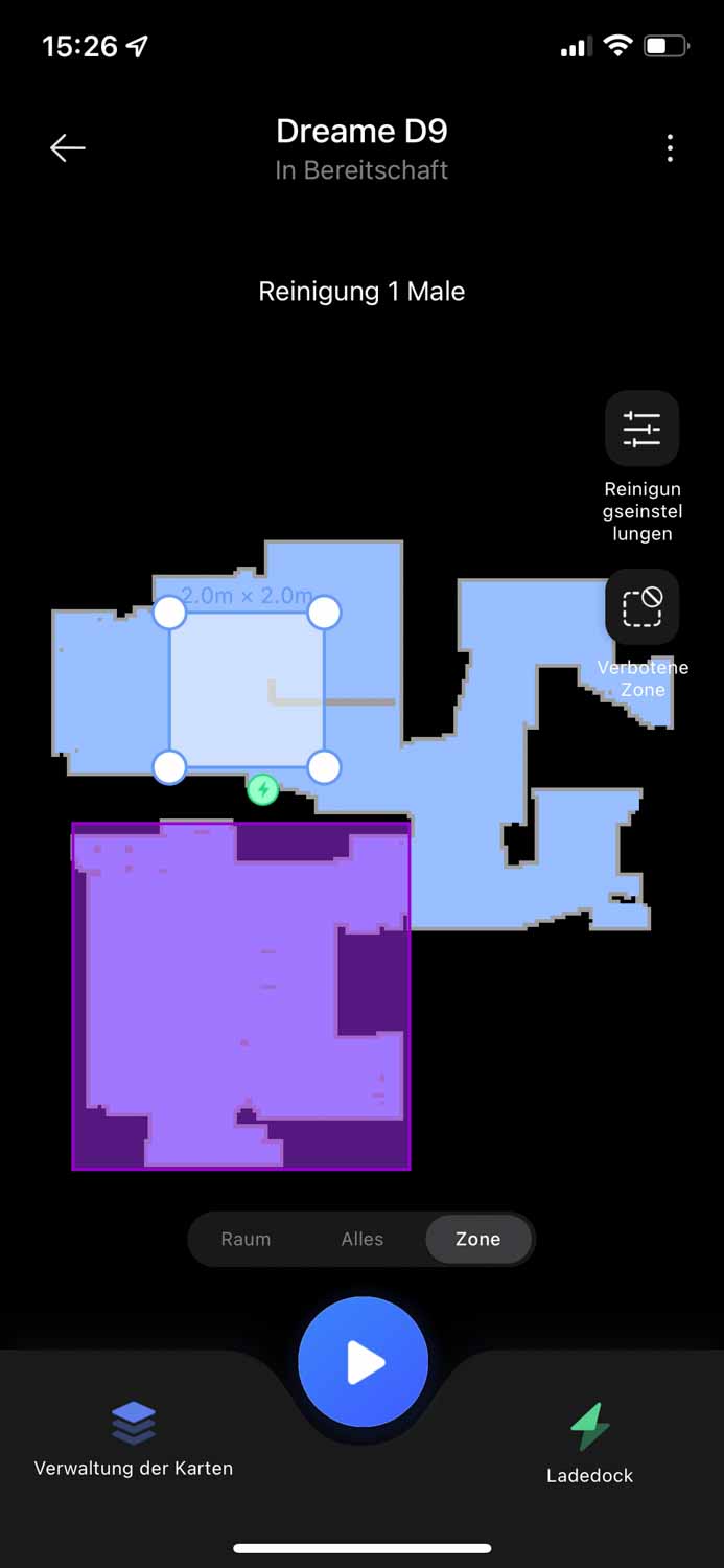 Natürlich ist es möglich, auf dieser erstellten Karte bestimmte Sperrbereiche für den Dreame D9 einzuzeichnen. Diese verhindern in zukünftigen Reinigungen das Befahren dieser. Dabei kann man unterscheiden, ob der Roboter diese komplett meiden soll oder ob er dort nur nicht wischen darf. Wer einen Teppich zu Hause liegen hat, der sollte so eine Nicht-Wischzone auf diesen legen. In der Praxis hat das tadellos funktioniert.