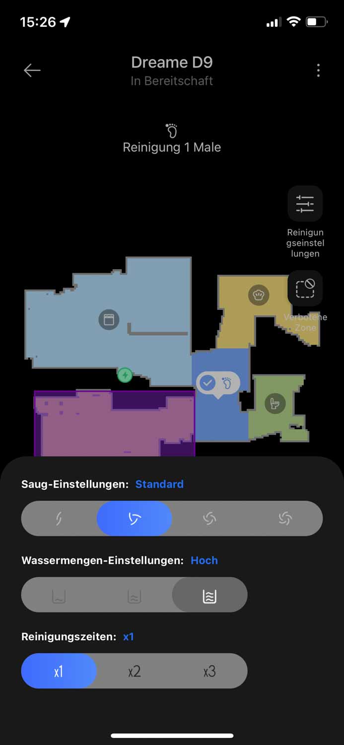 Es ist möglich, vor oder während der Reinigung die Saugstufe, die Wischleistung und die Reihenfolge der zu reinigenden Räume einzustellen. Bei einer vollständigen Reinigung kann der Dreame D9 jedoch nur einmal alles abfahren. Ausgewählte Räume hingegen kann er auch zwei oder dreimal reinigen. Die Saugleistung ist in vier Stufen und die Wischleistung in drei Stufen einstellbar. Leider ist es nicht möglich, einzelne Räume in der Leistung zu individualisieren. Entweder alles oder nichts.