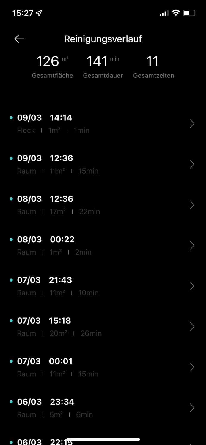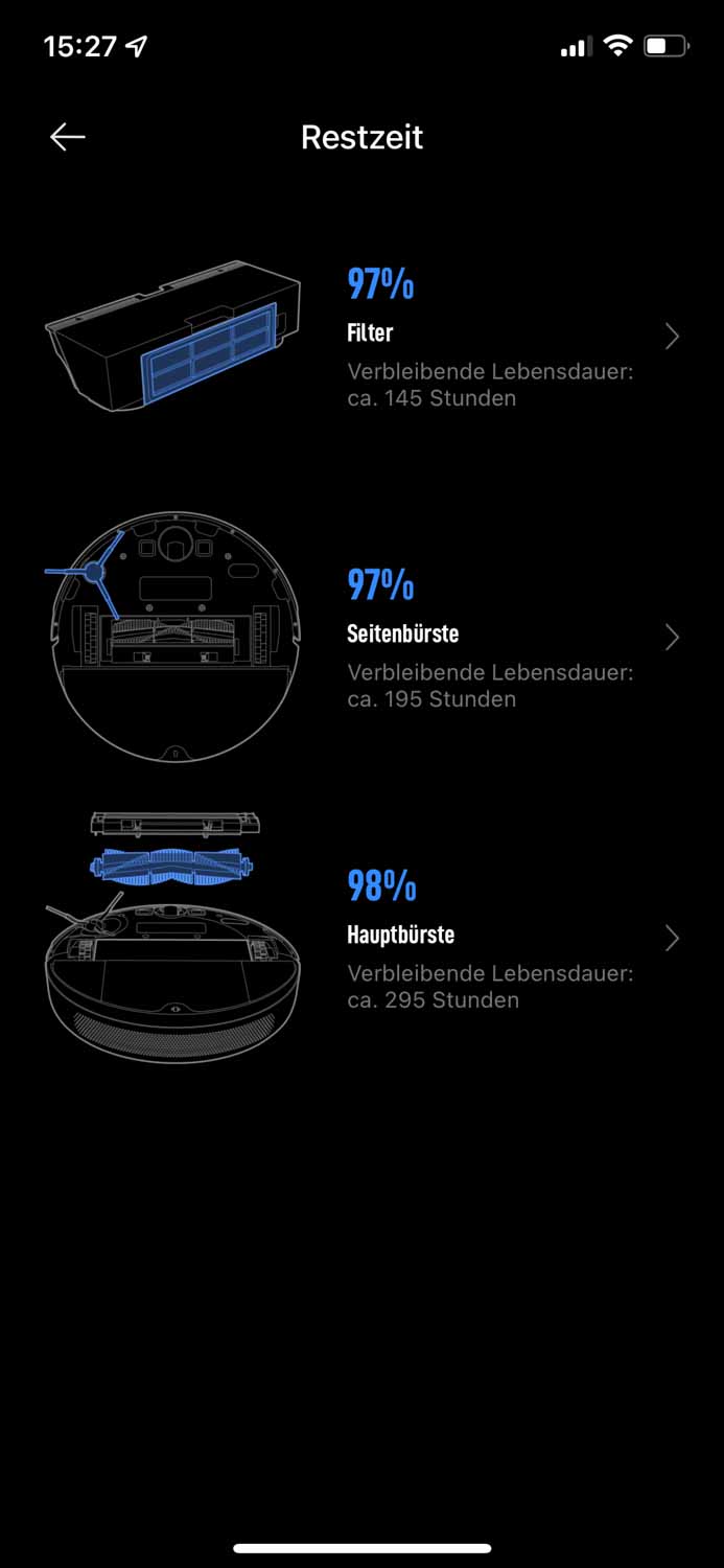 Abzurufen ist eine Ansicht, die zeigt, wann die letzten Reinigungen vonstattengingen. Wann die Verschleißteile den Geist aufgeben und sie gewechselt werden müssen, ist ebenfalls einsehbar. Die App enthält eine Fernsteuerung für den Dreame D9, die den Roboter manuell durch die Wohnung lenken lassen kann. Das ist vorwiegend dann praktisch, wenn der Roboter sich festgefahren hat.