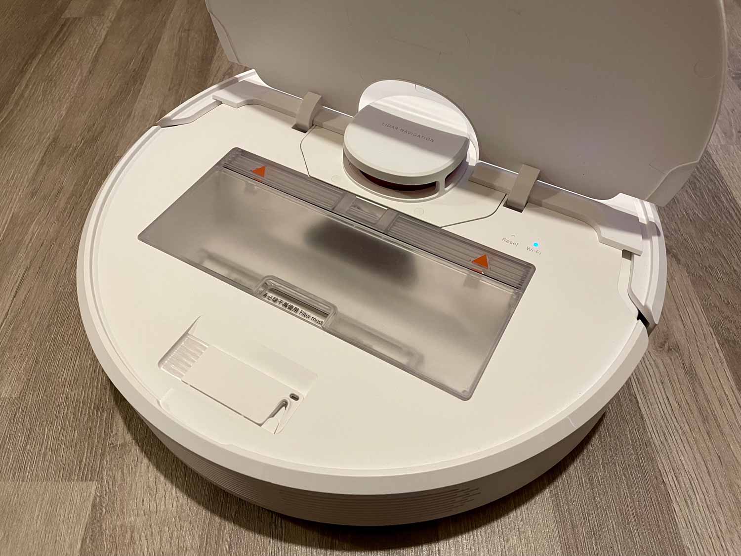 Unter der Haube des Dreame D9 verbirgt sich der voluminöse Staubbehälter, ein praktisches Reinigungstool, ein Resetbutton und natürlich die WIFI-LED. Eben genau wie bei seinen Brüdern von Roborock.