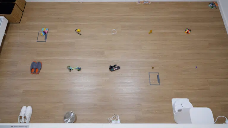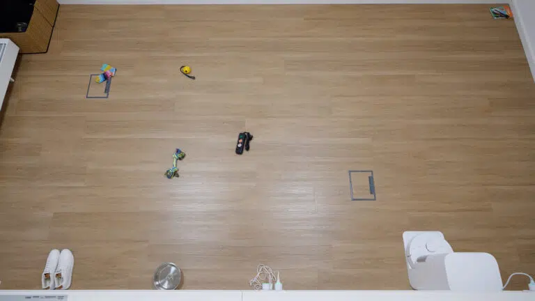 - Beachte: Die Hinderniserkennung ist im Vergleich zum Vorgänger schwächer – bei 16 ausgelegten Haushaltsgegenständen erkennt der Roboter nur einen Teil zuverlässig und fährt sich an kleinen Objekten immer wieder fest. Die Wischleistung bei eingetrockneten Flecken ist klar unzureichend.
