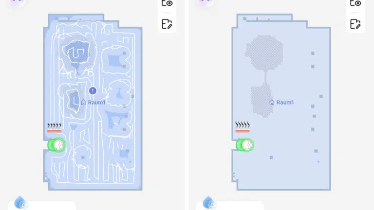 In unserem 25 m² großen Testraum hat der Roboter 22 % Akku verbraucht (0,88 % pro Quadratmeter) – das entspricht einer sehr effizienten Nutzung. Geht der Akku zur Neige, kehrt er zur Station zurück, lädt auf und setzt die Reinigung dort fort, wo er aufgehört hat.