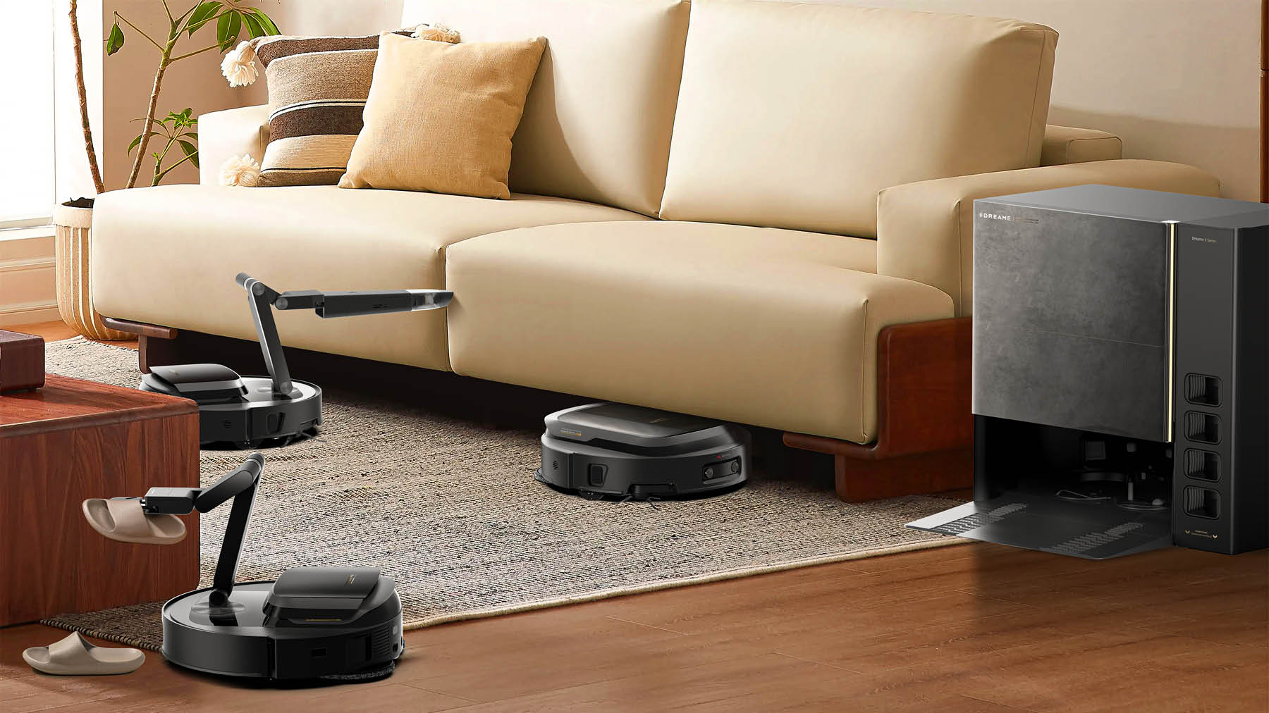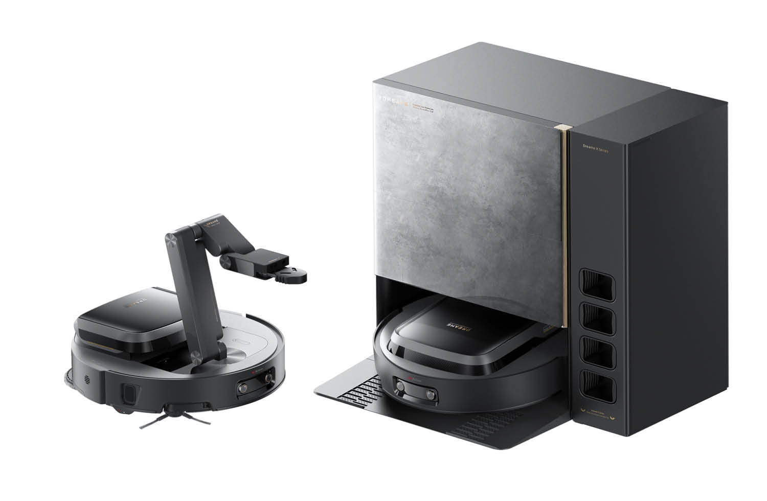 Der Dreame X50 Cyber kommt mit einer Basisstation, die auf dem neuesten Stand der Technik ist. Die Wischmopps werden heiß gewaschen, sterilisiert und getrocknet. Daraufhin wird auch der Staubbehälter des Saugroboters entleert. Besonders ist hier jedoch das Design. Mit einer fortschrittlichen IML-Technologie soll hier eine natürliche Steinstruktur nachgeahmt werden. Es gibt weiteres Zubehör in der Station: Auf der IFA wurde noch eine Aufbewahrungsstation vorgestellt, die vom Saugroboter selbst genutzt werden kann.