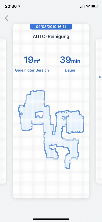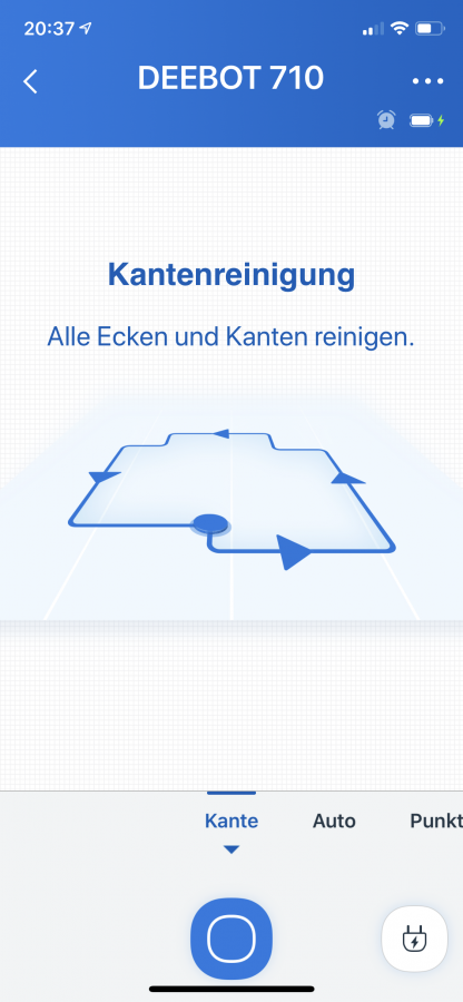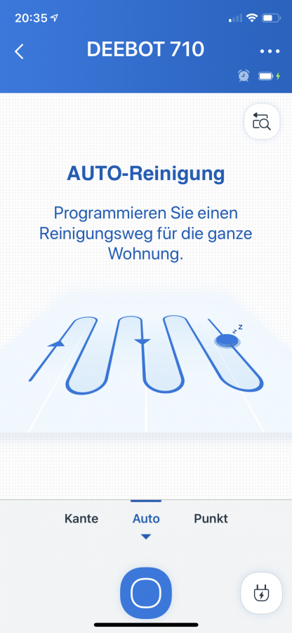 Das Starten des Roboters weit weg von seiner Station ist möglich. Er orientiert sich kurzzeitig und fährt dann wieder Bahn für Bahn die Räume ab. Kommt die Station während der Fahrt in seine Nähe, registriert er das und findet diese am Reinigungsende wieder. Wenn man ihn auf einer anderen Etage startet, kehrt er nach der Reinigung zum Ausgangspunkt zurück. Im Spotcleanmodus fährt der DEEBOT 710 einen immer größer werdenden Kreis von innen nach außen und wieder zurück. Der Randreinigungsmodus ist wohl selbsterklärend.