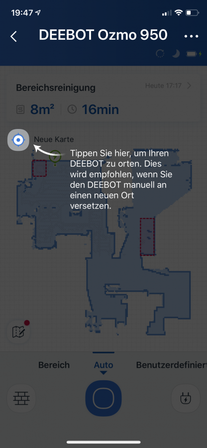 Wie schon angesprochen, plant der DEEBOT OZMO 950 seinen Reinigungsweg selbst. Dies macht er äußerst intelligent. Er fährt nicht von einem zum anderen Ende die Bahnen durch, sondern teilt sich einen einzelnen Raum so ein, dass er so schnell wie nur möglich fertig wird. Augenscheinlich kommt es einem im ersten Moment so vor, als würde er von Anfang an schon ein paar Stellen auslassen und einfach seine Bahnen mittendrin abbrechen. Der Schein trügt in diesem Fall! Der Roboter kehrt zurück und saugt auch diese Stellen.