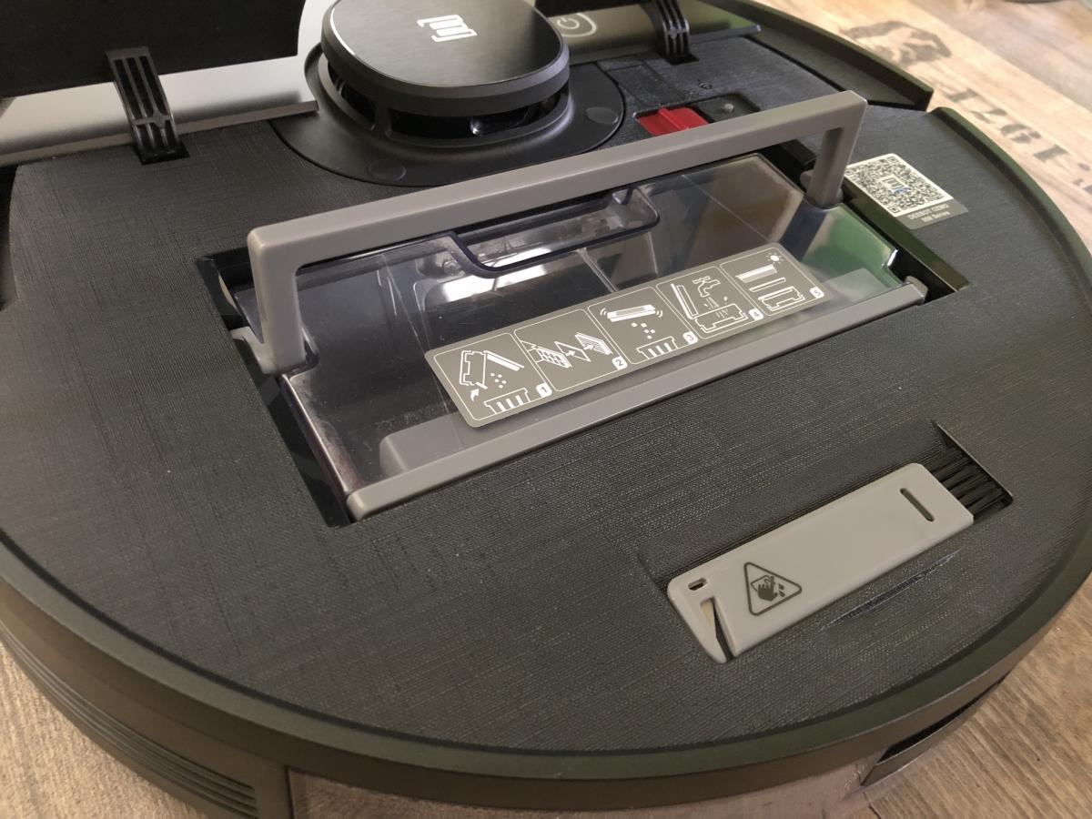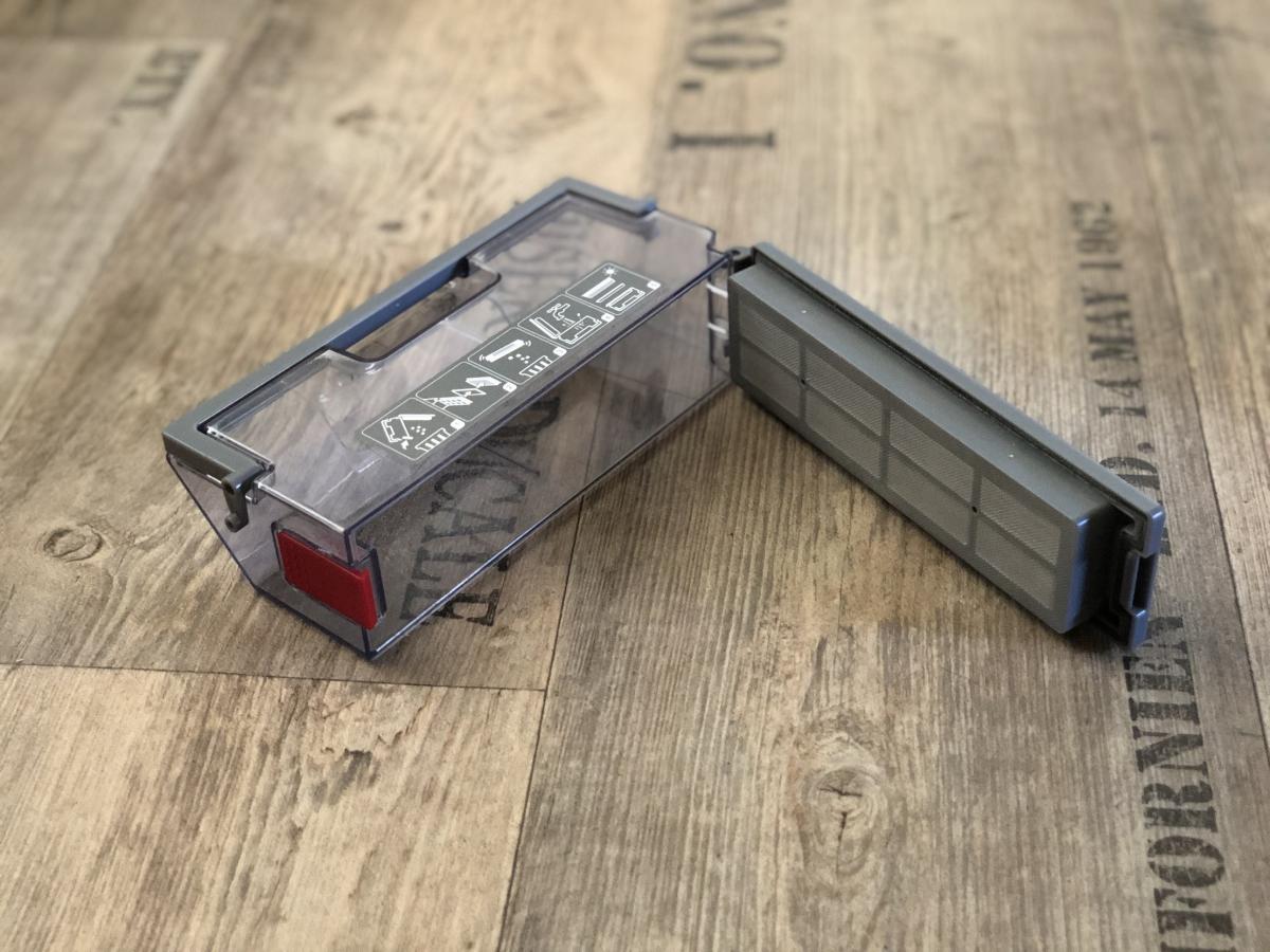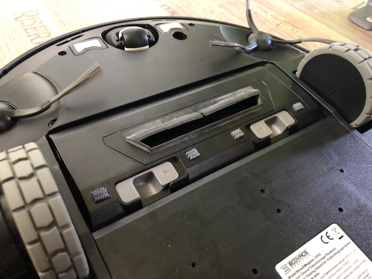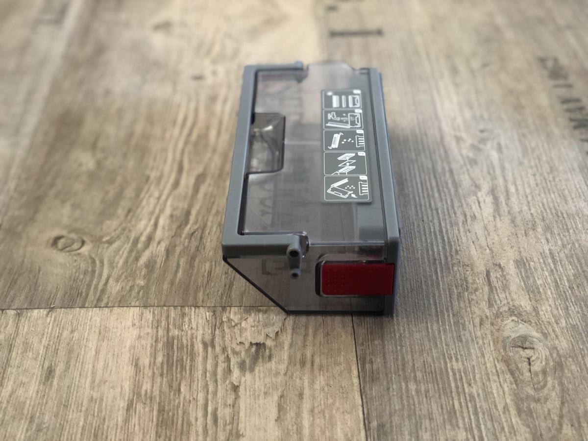 Der Staubbehälter ist mit einem Volumen von 430 ml recht klein, aber dennoch ausreichend bemessen. Dieser weist eine Besonderheit zu seinen Vorgängern auf. Er lässt sich durch Druck auf einen roten Schalter ganz einfach öffnen und muss nicht mehr durch Aufziehen entriegelt werden. Dennoch stellt sich das Entleeren als schwierig heraus, da der Filter direkt an der zu öffnenden Klappe sitzt. Der Roboter saugt den Schmutz so sehr an, dass dieser sich am Filter festsetzt und herausfallen kann, wenn man die Klappe öffnet. Die Saugöffnung ist im Gegensatz zum DEEBOT OZMO 900 wieder nach oben gewandert. Das verhindert das Herausfallen von Schmutz während der Reinigung. Zusätzlich ist ein Tragegriff und eine Rückschlagklappe angebracht.