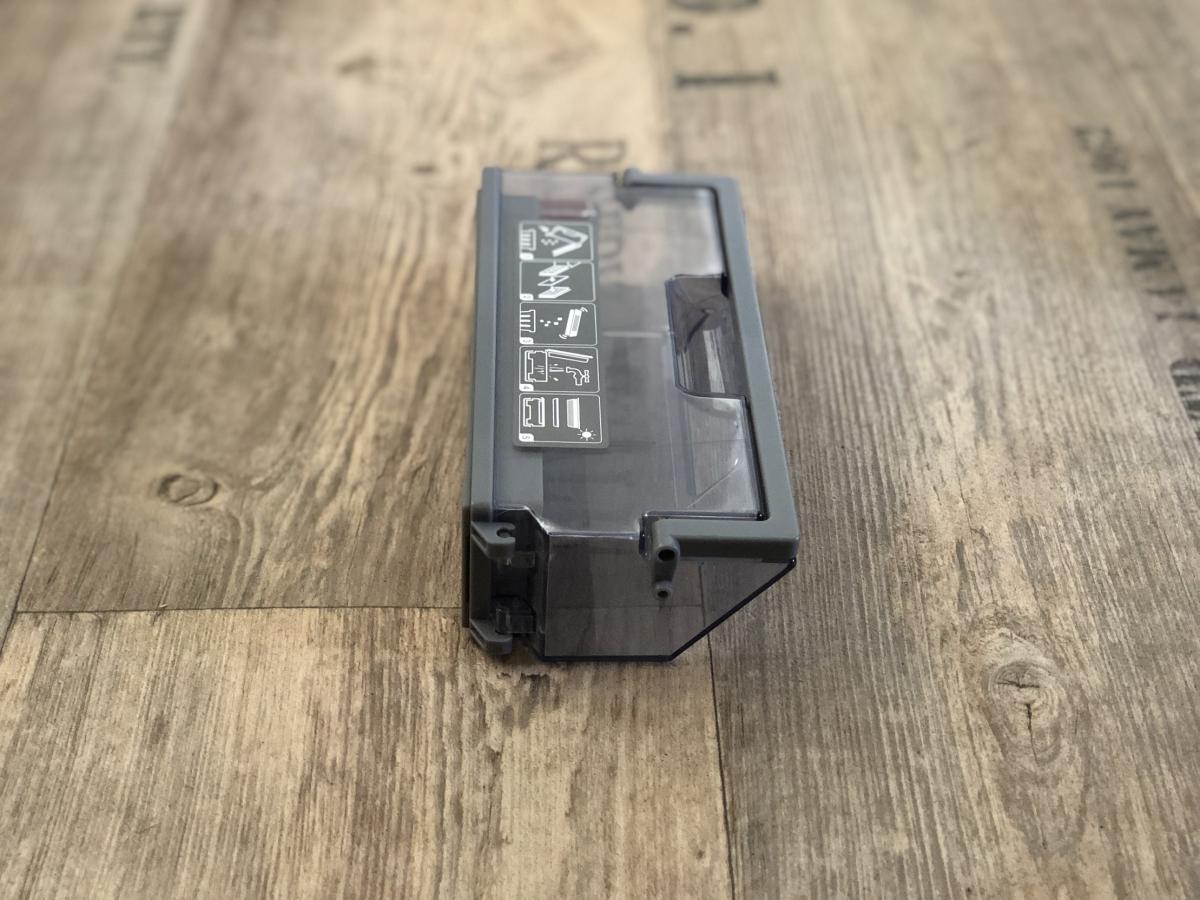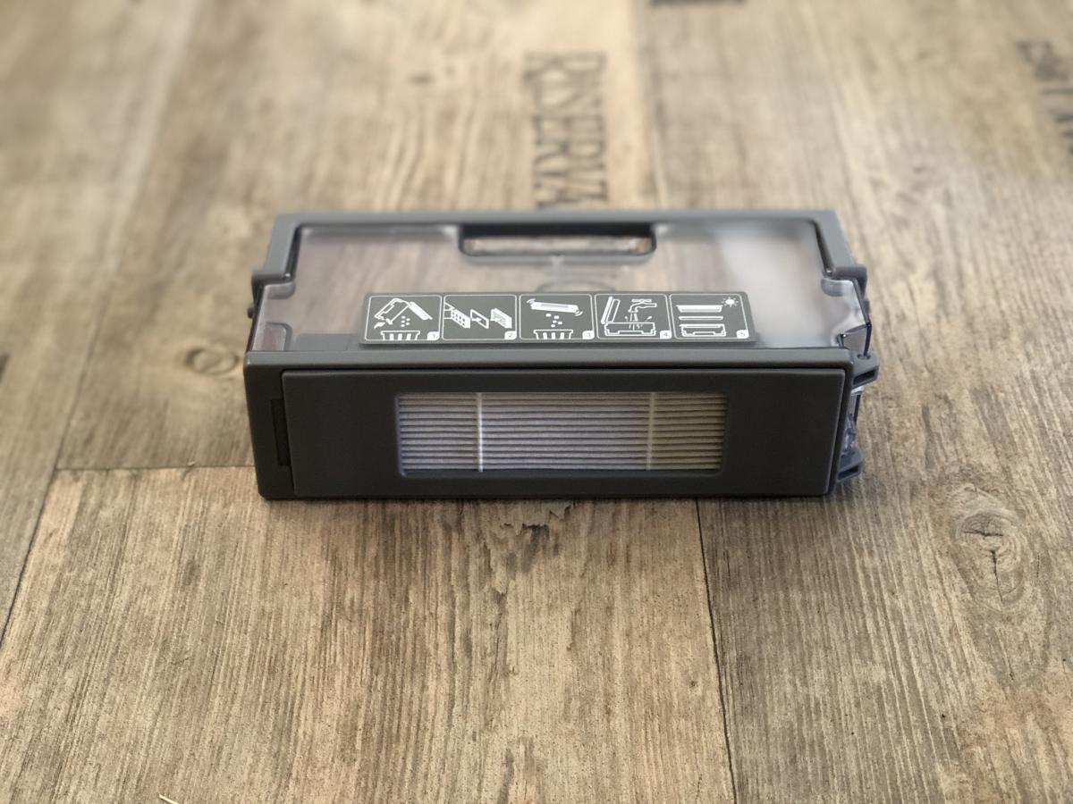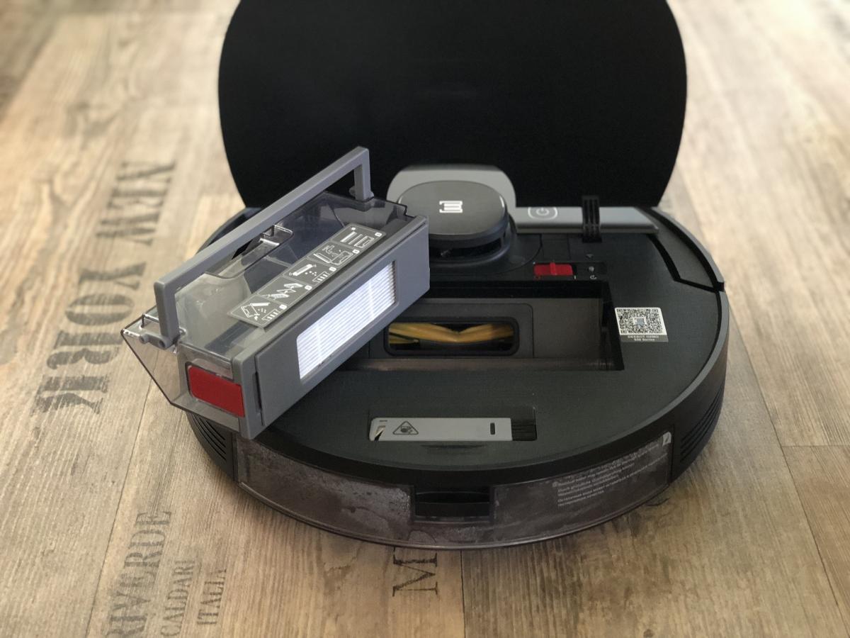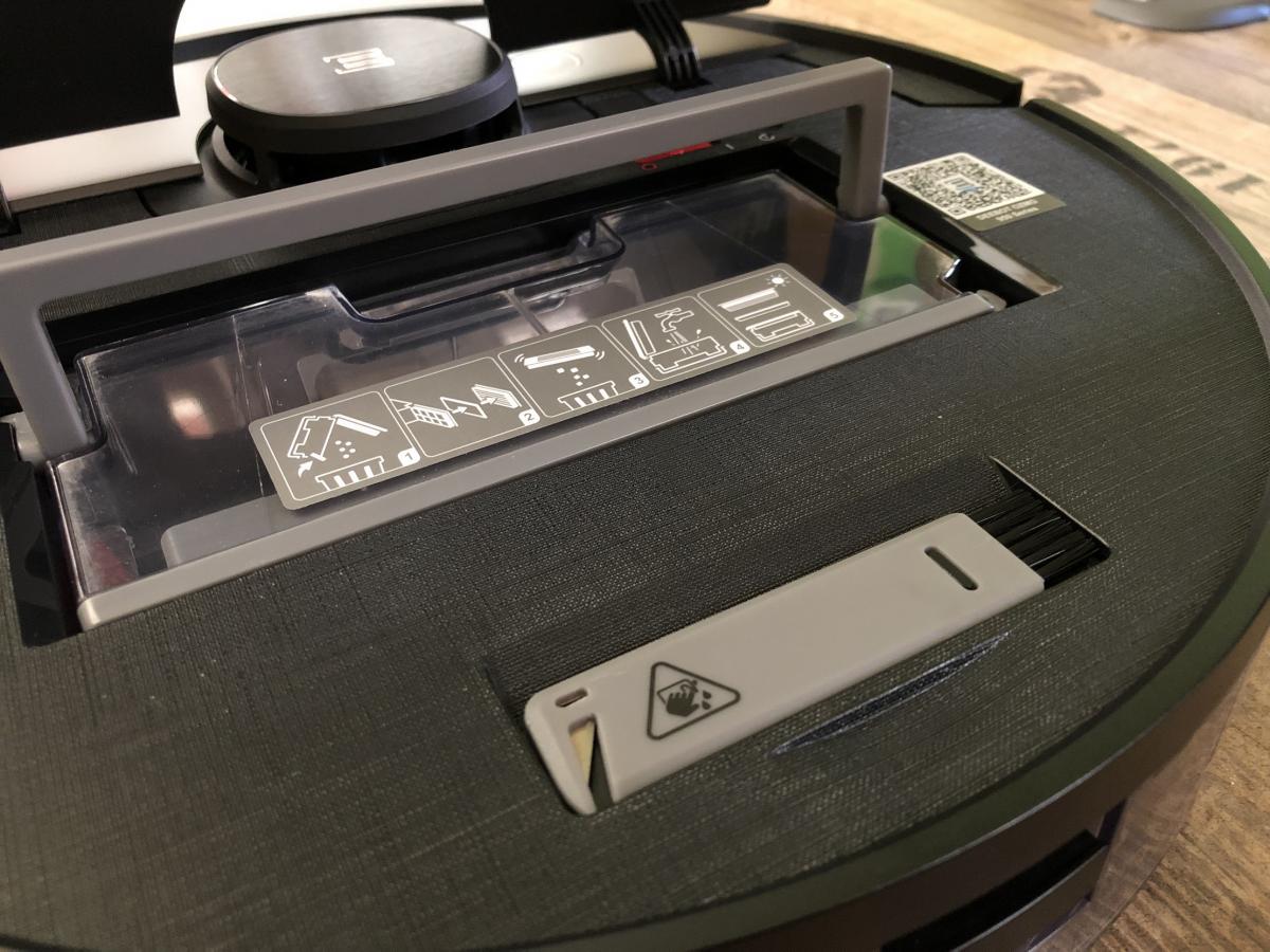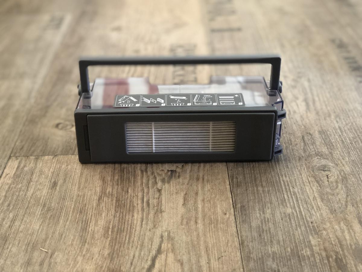 Der Staubbehälter ist mit einem Volumen von 430 ml recht klein, aber dennoch ausreichend bemessen. Dieser weist eine Besonderheit zu seinen Vorgängern auf. Er lässt sich durch Druck auf einen roten Schalter ganz einfach öffnen und muss nicht mehr durch Aufziehen entriegelt werden. Dennoch stellt sich das Entleeren als schwierig heraus, da der Filter direkt an der zu öffnenden Klappe sitzt. Der Roboter saugt den Schmutz so sehr an, dass dieser sich am Filter festsetzt und herausfallen kann, wenn man die Klappe öffnet. Die Saugöffnung ist im Gegensatz zum DEEBOT OZMO 900 wieder nach oben gewandert. Das verhindert das Herausfallen von Schmutz während der Reinigung. Zusätzlich ist ein Tragegriff und eine Rückschlagklappe angebracht.