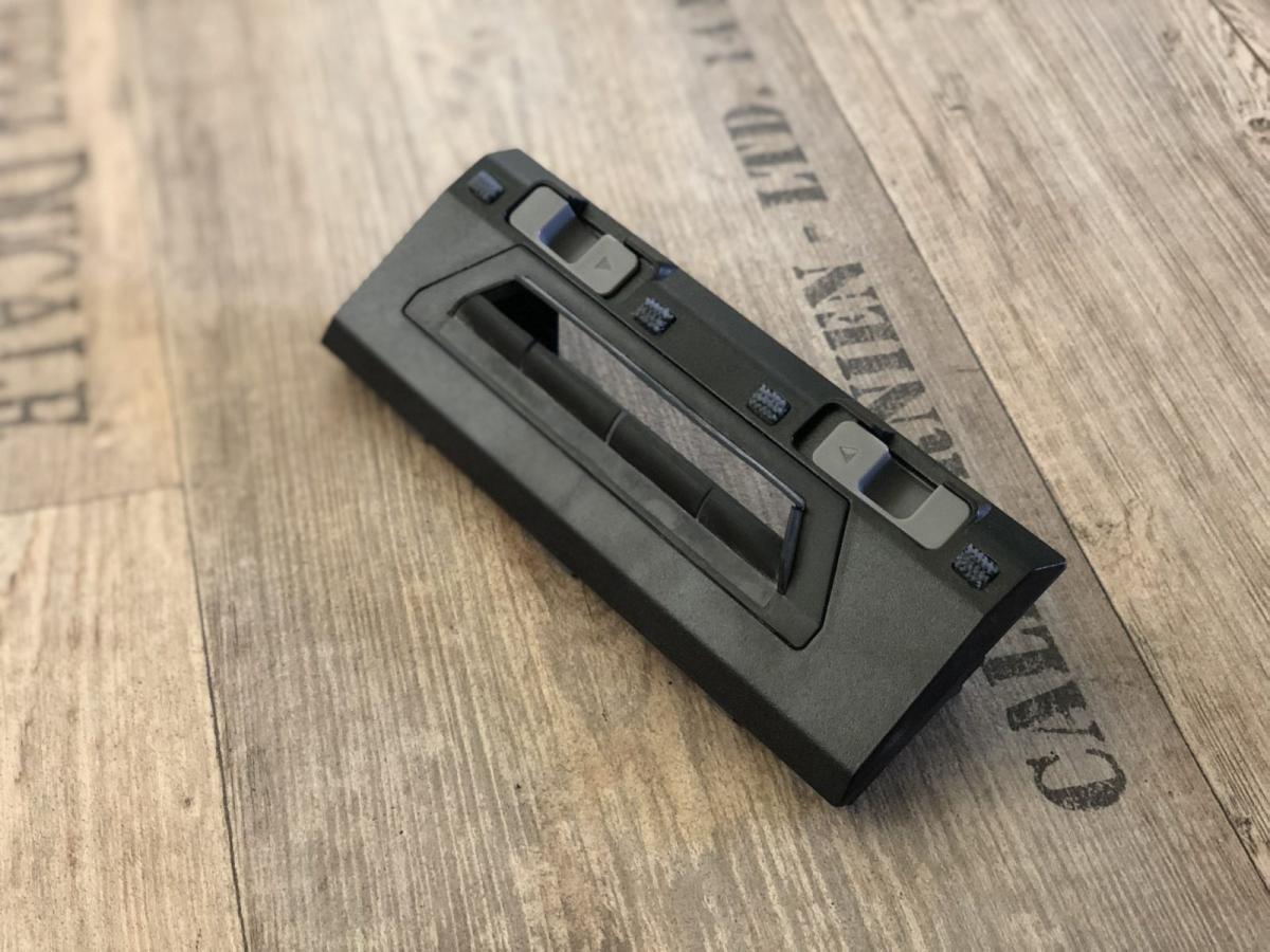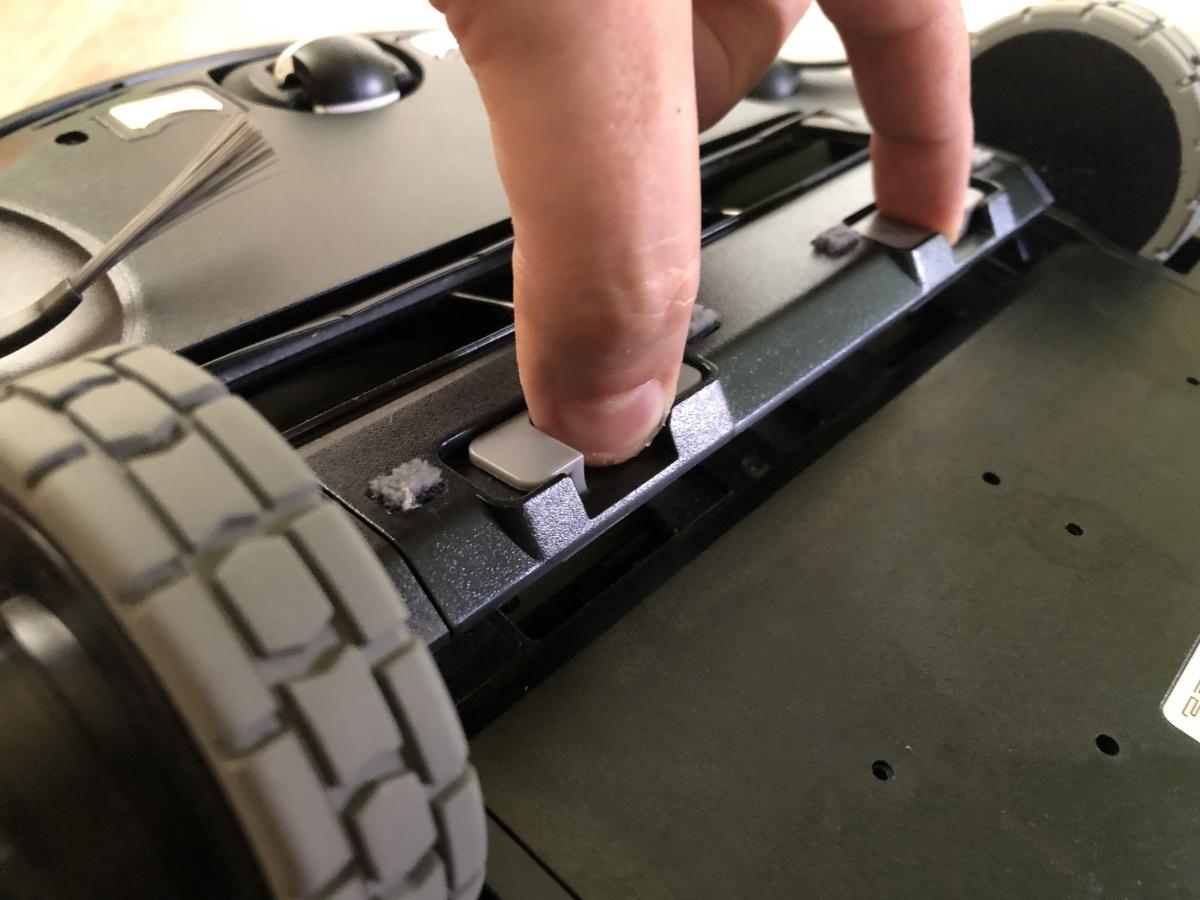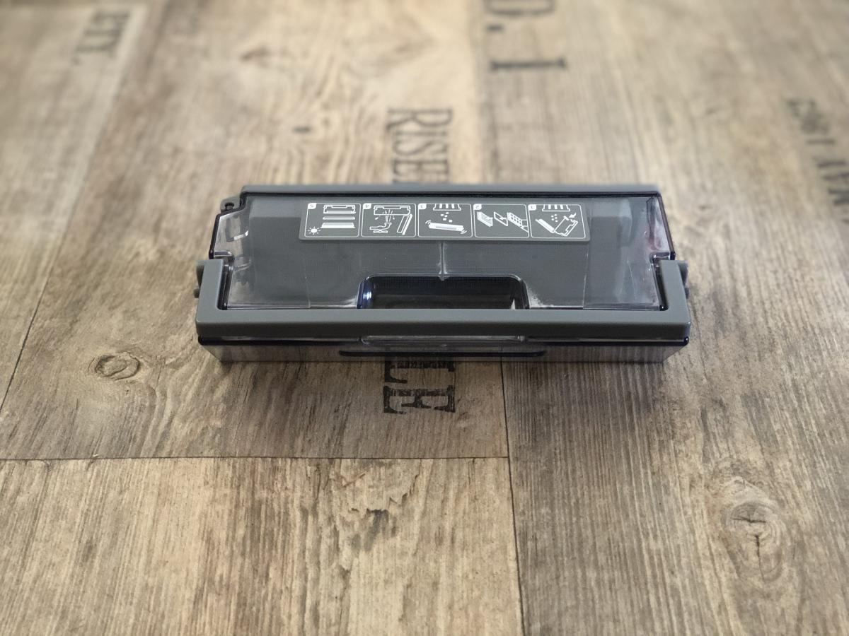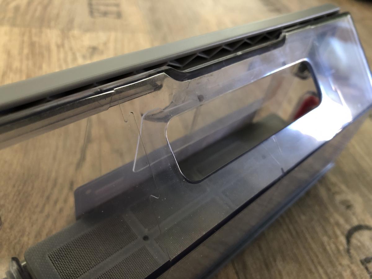 Der Staubbehälter ist mit einem Volumen von 430 ml recht klein, aber dennoch ausreichend bemessen. Dieser weist eine Besonderheit zu seinen Vorgängern auf. Er lässt sich durch Druck auf einen roten Schalter ganz einfach öffnen und muss nicht mehr durch Aufziehen entriegelt werden. Dennoch stellt sich das Entleeren als schwierig heraus, da der Filter direkt an der zu öffnenden Klappe sitzt. Der Roboter saugt den Schmutz so sehr an, dass dieser sich am Filter festsetzt und herausfallen kann, wenn man die Klappe öffnet. Die Saugöffnung ist im Gegensatz zum DEEBOT OZMO 900 wieder nach oben gewandert. Das verhindert das Herausfallen von Schmutz während der Reinigung. Zusätzlich ist ein Tragegriff und eine Rückschlagklappe angebracht.