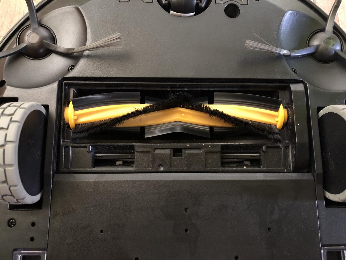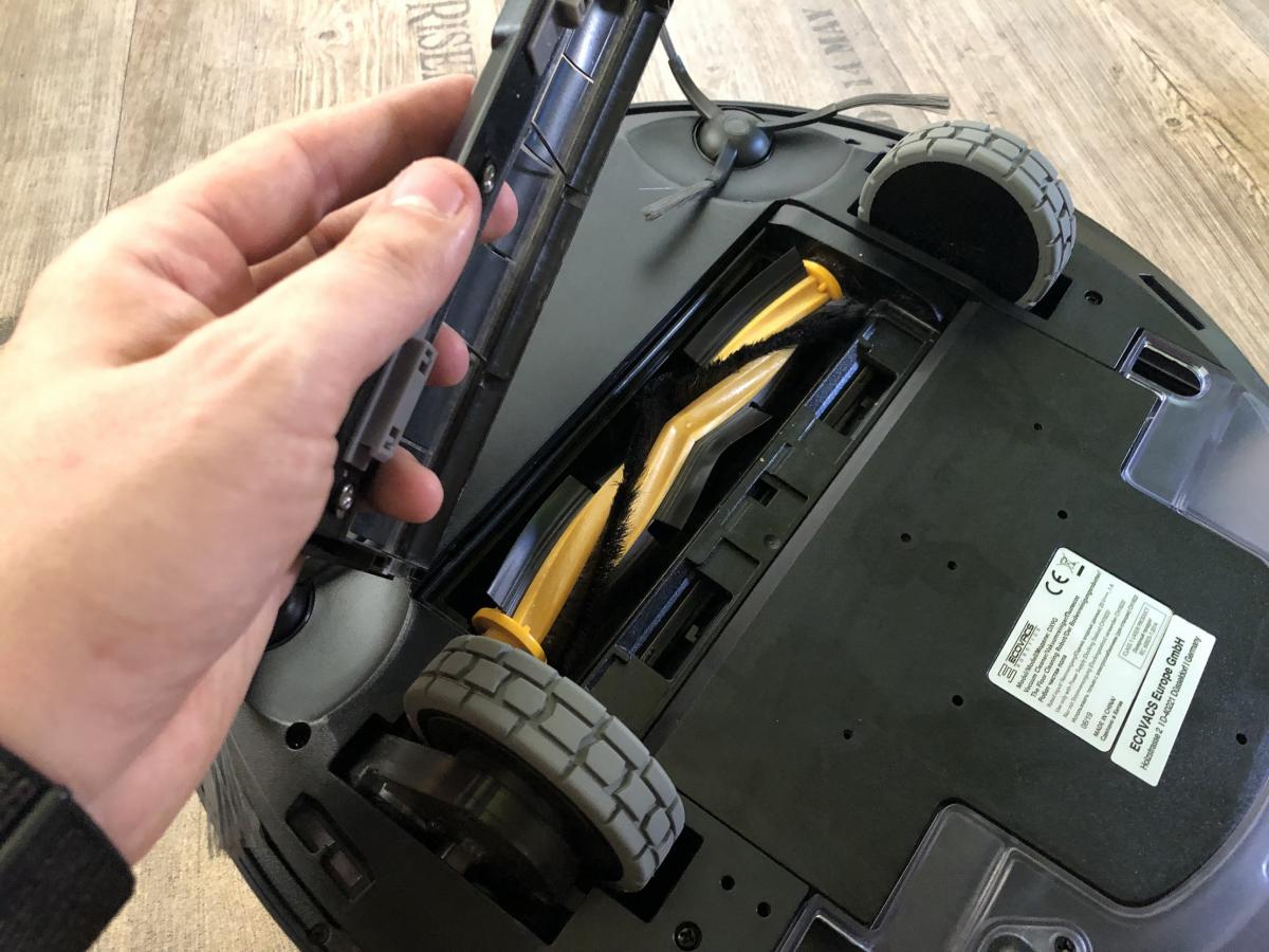 Unter seiner Klappe findet man den Staubbehälter, ein ins Gerät eingelassenes Reinigungstool, sowie einen Powerschalter, eine WLAN-Anzeige und einen Resetknopf. Außerdem weist die Fläche unter der Klappe ein geriffeltes Muster auf, das den Roboter noch viel schicker erscheinen lässt. Auf der Unterseite des Roboters findet man die typischen Fallsensoren, eine Kombibürste und zwei Seitenbürsten. Der Wassertank sitzt am Heck des Roboters und ist in diesen integriert.