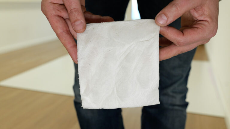 Und der Schmutz wird auch wirklich vom Boden aufgenommen, das zeigt ein weißes, feuchtes Tuch, mit dem wir im Anschluss an den Test nachwischen. Das Tuch bleibt fast komplett sauber – ein wirklich hervorragendes Ergebnis. Hier zahlt sich die innovative Wischwalzentechnologie aus.