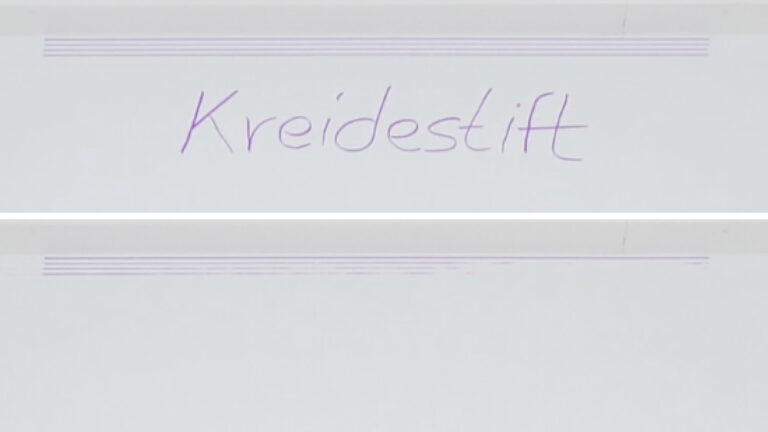 Auf dem strukturierten Boden spielte dann die Flecken- bzw. Hinderniserkennung dem Roboter einen Streich. Die Schrift deutete der DEEBOT T90 PRO OMNI offenbar als Hindernis und meidete so die Stellen. Dementsprechend viel blieb noch vom Kreidestift auf dem Boden.