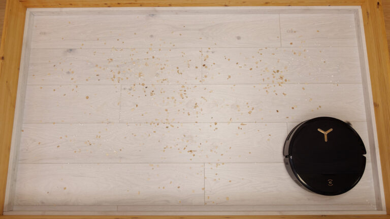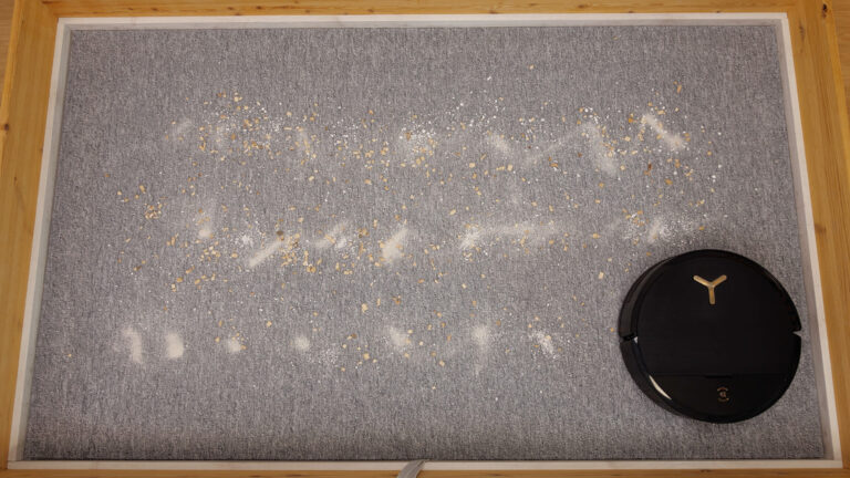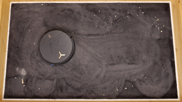 Ausgestattet wurde der ECOVACS DEEBOT X9 PRO OMNI werksseitig mit 16.600 Pascal Saugkraft. Die Pascal-Angabe ist jedoch nicht entscheidend, wenn das Zusammenspiel der Saugleistung mit der verbauten Bodenbürste und der Bürstenaufhängung nicht harmoniert. Genau das versuchen wir in unseren Saugtests herauszufinden und befüllen unser Testareal mit einem 100 g schweren Schmutzmix aus Vogelsand, Katzenstreu und Holzspänen. Der Saugroboter entscheidet dabei selbst, wie er das Areal säubert; lediglich die Saugleistung wurde von uns im Vorfeld auf das Maximum gesetzt.