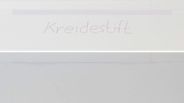 Die Randreinigung mit dem ECOVACS DEEBOT X9 PRO OMNI stellte sich als nicht perfekt heraus. Von unseren vier aufgemalten Kreidestiftstrichen hat er den am nächsten am Rand gelegenen Strich gar nicht berührt und den davor nur zur Hälfte richtig entfernt. Das Ergebnis lässt also zu wünschen übrig. Die Striche hatten einen Abstand von jeweils 1 cm zueinander.