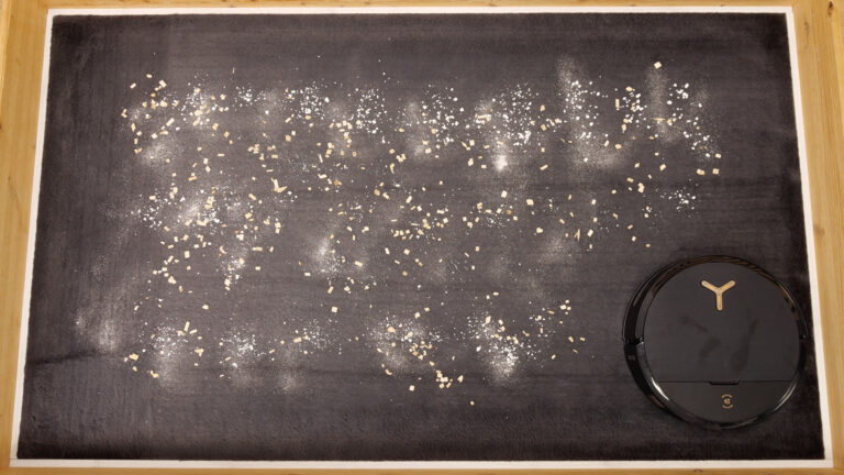 Der ECOVACS DEEBOT X9 PRO OMNI verfügt, wie sein Vorgänger auch, über eine rotierende Wischwalze, die bis zum Rand ausgefahren werden kann. Das Reinigungsergebnis müsste gegenüber rotierenden Wischmopps theoretisch besser sein, da er das anfallende Schmutzwasser dabei aufnimmt und in seinem Abwassertank zum Entleeren zur Station bringt. Um das zu testen, verschmutzen wir unterschiedliche Untergründe mit Alltagsschmutz, den das Gerät aufwischen soll. Dabei möchte ich erwähnen, dass der Saugroboter jederzeit Zugang zu seiner Station besitzt. Wir aktivieren dafür auch die KI des Geräts, damit er hartnäckige Flecken erkennt und sich diesen widmet.