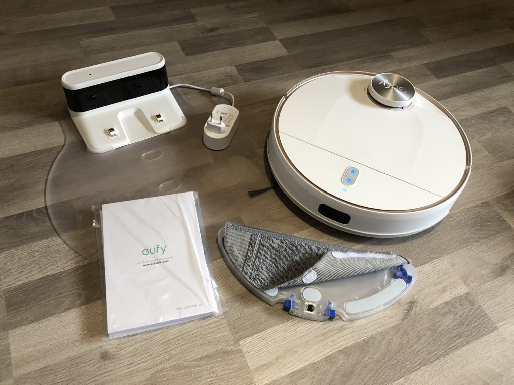 Der Eufy kommt mit einem wirklich mageren Lieferumfang daher. Im Lieferumfang befindet sich lediglich der Roboter selbst, eine Ladestation, ein Netzkabel mit Eurostecker, eine Wischplatte mit Mikrofasertuch, eine Abstellplatte aus Kunststoff und die Betriebsanleitung. Das war es auch schon.