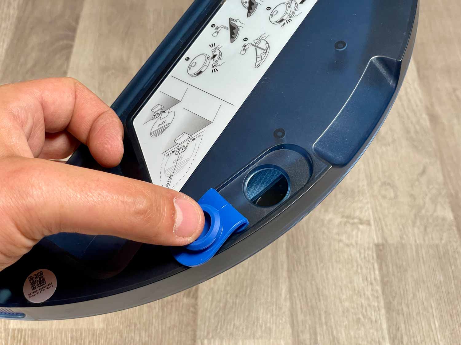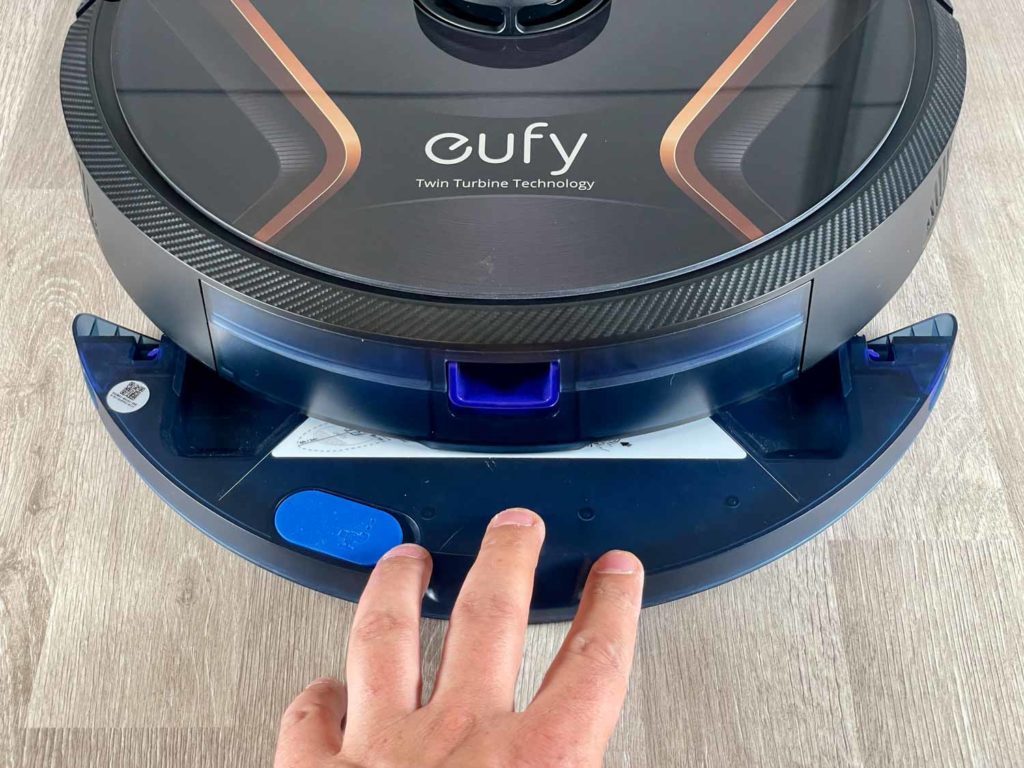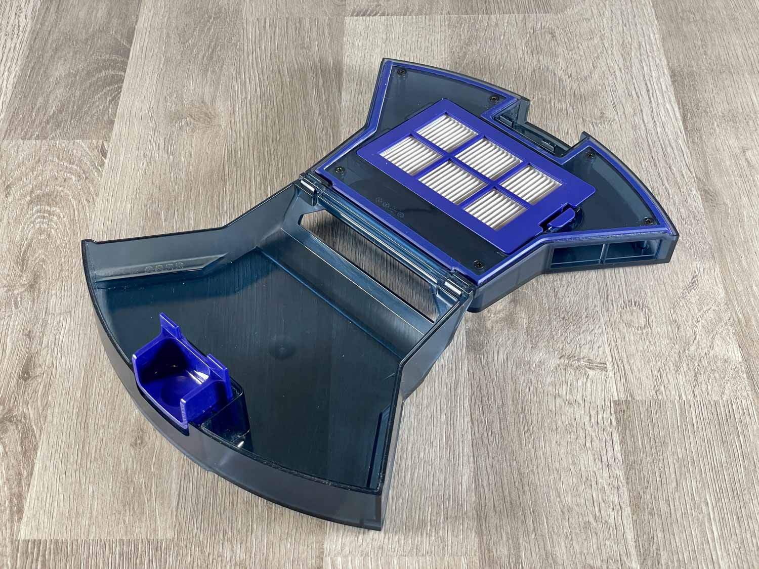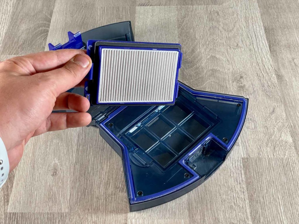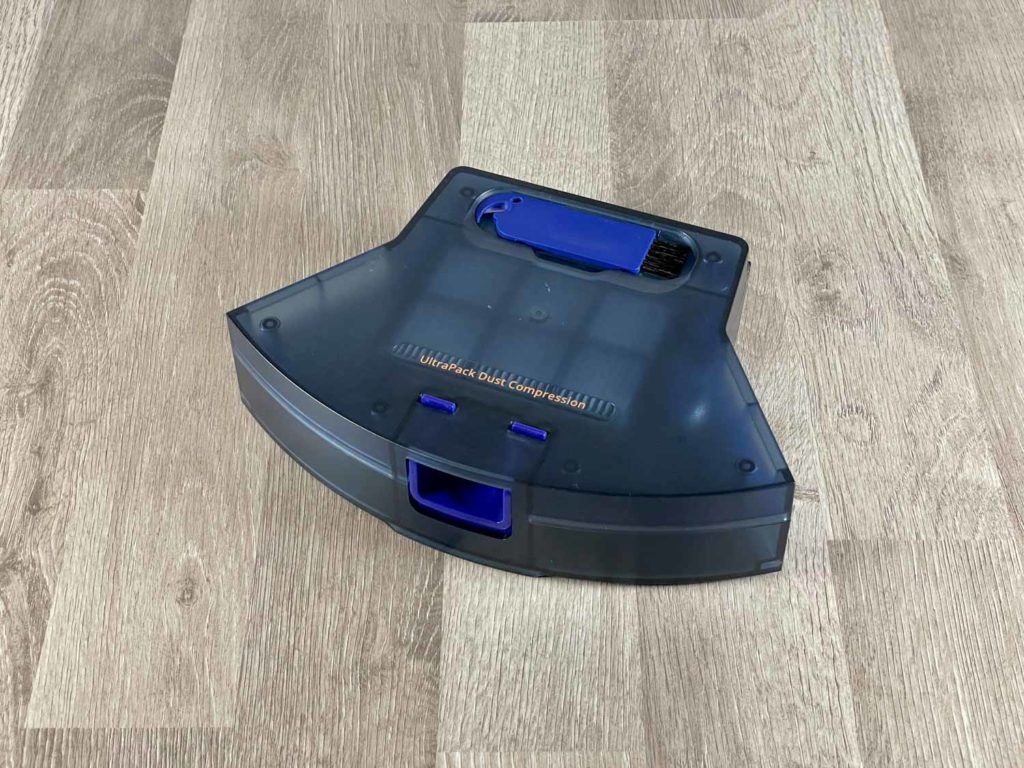 Der einfache, aber große, bläuliche Staubbehälter befindet sich im Heck des eufy RoboVac X8 Hybrid. Dieser lässt sich einfach und komfortabel entnehmen, wie auch entleeren. Leider besitzt der Saugschacht keine Rückschlagklappe, die den Schmutz beim Entnehmen des Staubbehälters im Behälter festhält. Hier muss man etwas Acht geben. Der Feinstaubfilter sitzt in einem separaten Schacht und filtert schädliche Partikel aus der Abluft. Auf der Außenseite des Staubbehälters wurde zusätzlich ein Reinigungswerkzeug eingebettet, das sofort griffbereit ist.