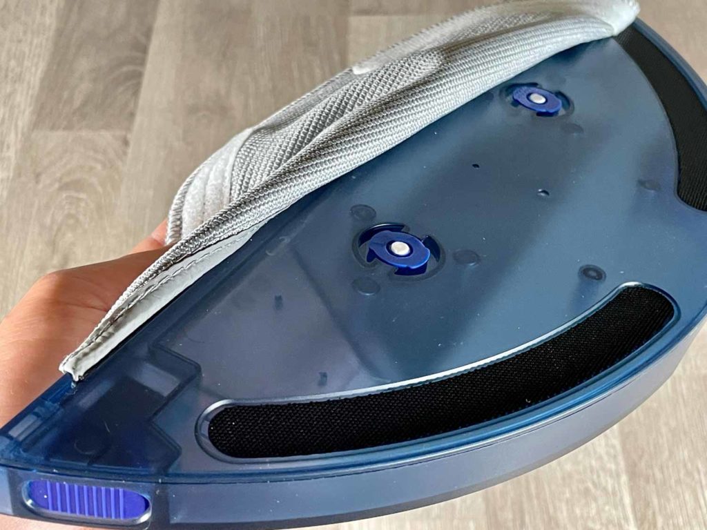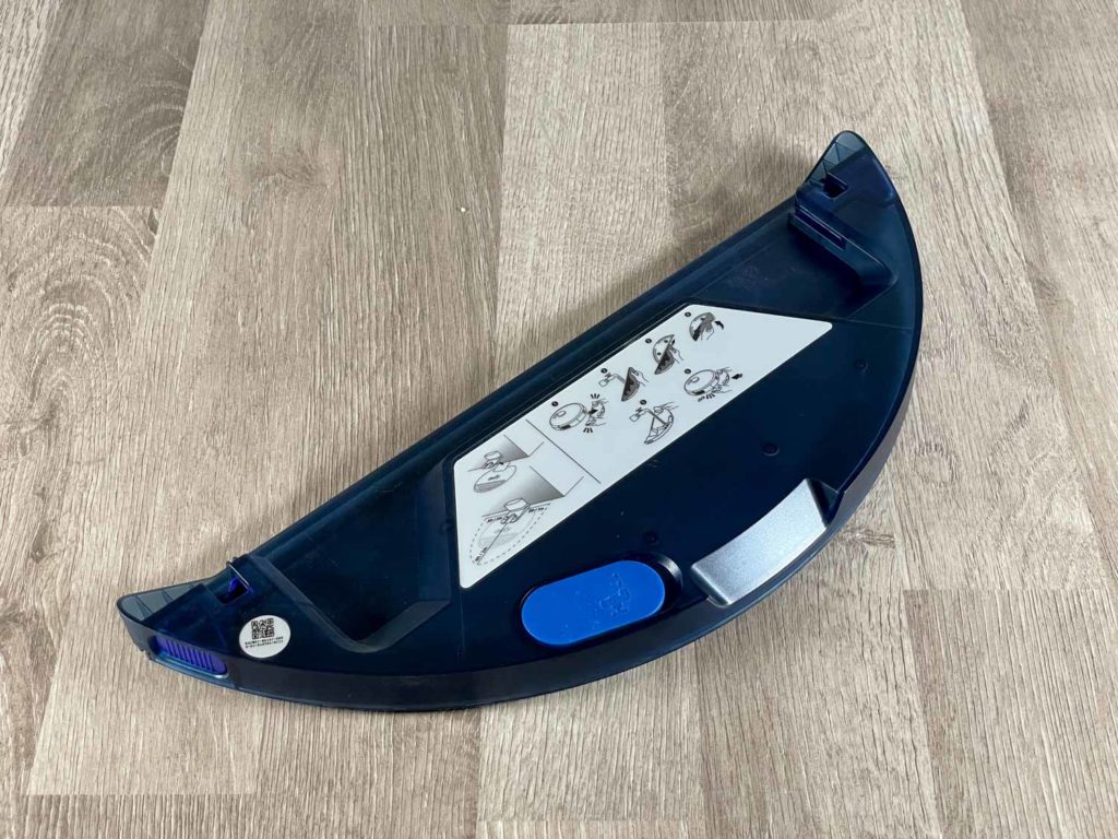 Der beigefügte Wassertank ist nicht sonderlich groß, lässt sich jedoch komfortabel unter dem Roboter einrasten. Der Wassertank besitzt weder eine Wasserpumpe noch eine elektronische Steuerung. Das eingesetzte Wasser tröpfelt langsam aus zwei kleinen Filtern auf das Wischtuch. Somit sollte man den Wassertank nach jedem Wischen entfernen, sonst kann es eine Pfütze geben. Für diesen Fall hat der Hersteller eine Unterlegplatte dazugegeben, die den ersten Wasseraustritt auffangen soll. Das anmontierte wiederverwendbare Wischtuch, sowie alle Einwegwischtücher wischen auf gesamter Wischbreite.