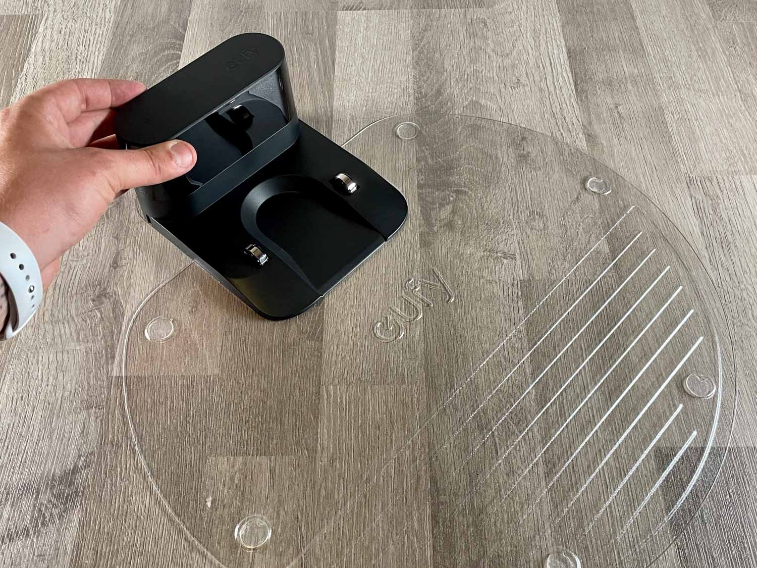 Falls man nicht sofort zum Abziehen des Wassertanks nach der Reinigung kommt, hat eufy dem Roboter eine Unterlegplatte mitgegeben, die das Wasser auffangen soll. Das macht sie sogar recht zuverlässig, jedoch hat auch die Platte ihre Kapazitätsgrenzen. Irgendwann läuft hier das Wasser über. Was ich auch eher unangenehm empfinde, ist die Tatsache, dass die Unterlegplatte auf den Boden geklebt werden muss, damit sie nicht verrutscht. Einmalig ist das machbar, das Abziehen jedoch führt zu Kleberesten auf dem Boden. In meinen Augen hätte sich der Hersteller die Wischfunktion bei diesem Gerät einfach sparen können.