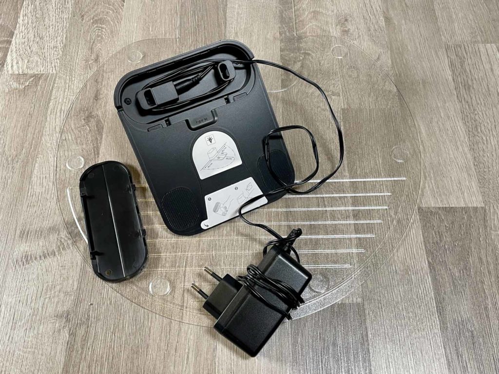 Die komplett schwarze, einfache aber praktische Ladestation bietet keine großen Neuerungen. Auf zwei Ladekontakte bekommt der angedockte Roboter seinen Strom und das EU-Netzkabel kann praktisch in einem innen liegenden Kabelmanagement verstaut werden. Beim Aufladen verbraucht der Roboter umgerechnet 27 Watt und im aufgeladenen Zustand verbraucht er gerade einmal 1,2 Watt.