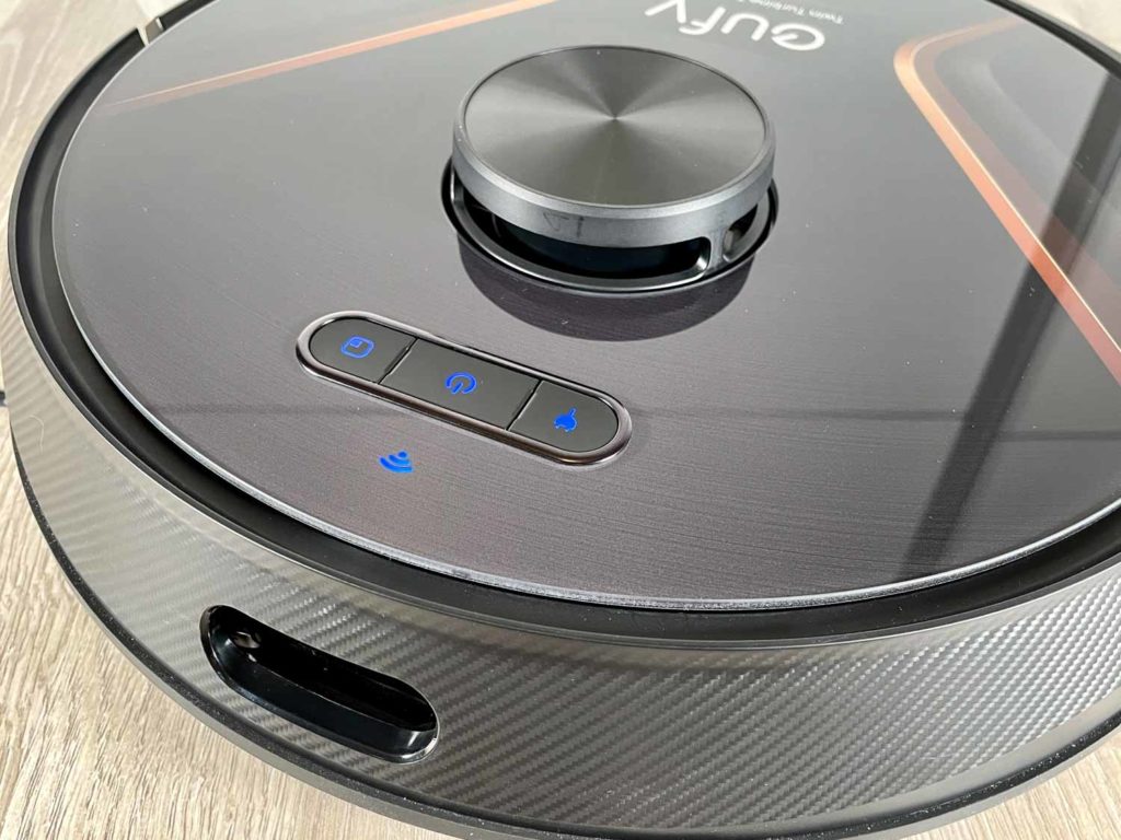 Auf der hochglänzenden und bedruckten Oberseite befindet sich recht auffällig der aufgesetzte LiDAR-Turm. Kurz davor befinden sich drei Steuerelemente, mit denen man den Roboter starten, stoppen oder zur Ladestation zurückschicken kann. ein kleiner Knopf für die Punktreinigung ist ebenfalls vorhanden. Vor den Bedienelementen thront zusätzlich eine Wi-Fi-LED. Etwas weiter hinten befindet sich der stylishe Aufdruck und das eufy-Logo. Eine Haube besitzt der Roboter nicht, da der Staubbehälter von hinten aus dem Roboter gezogen wird.