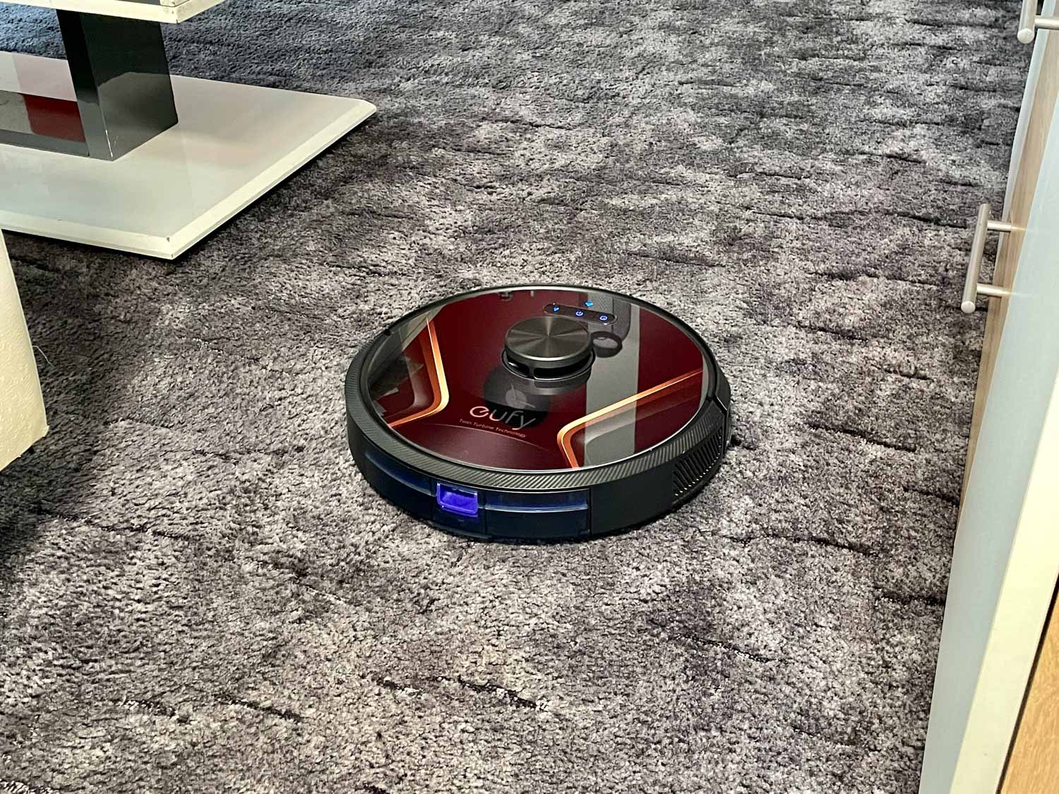 In meinem Test fuhr der eufy RoboVac X8 Hybrid in zehn von zehn Fällen immer zuverlässig zur Ladestation zurück und dockte Kerzengerade an. Das sieht schön aus, da er kaum ein wenig schräg auffährt und auch immer beim ersten Versuch andockt. Auf seinem Rückweg hingegen, kann es vorkommen, dass der Roboter mal wo dagegen stößt. Er korrigiert jedoch immer sofort seine Bahn und fährt weiter.