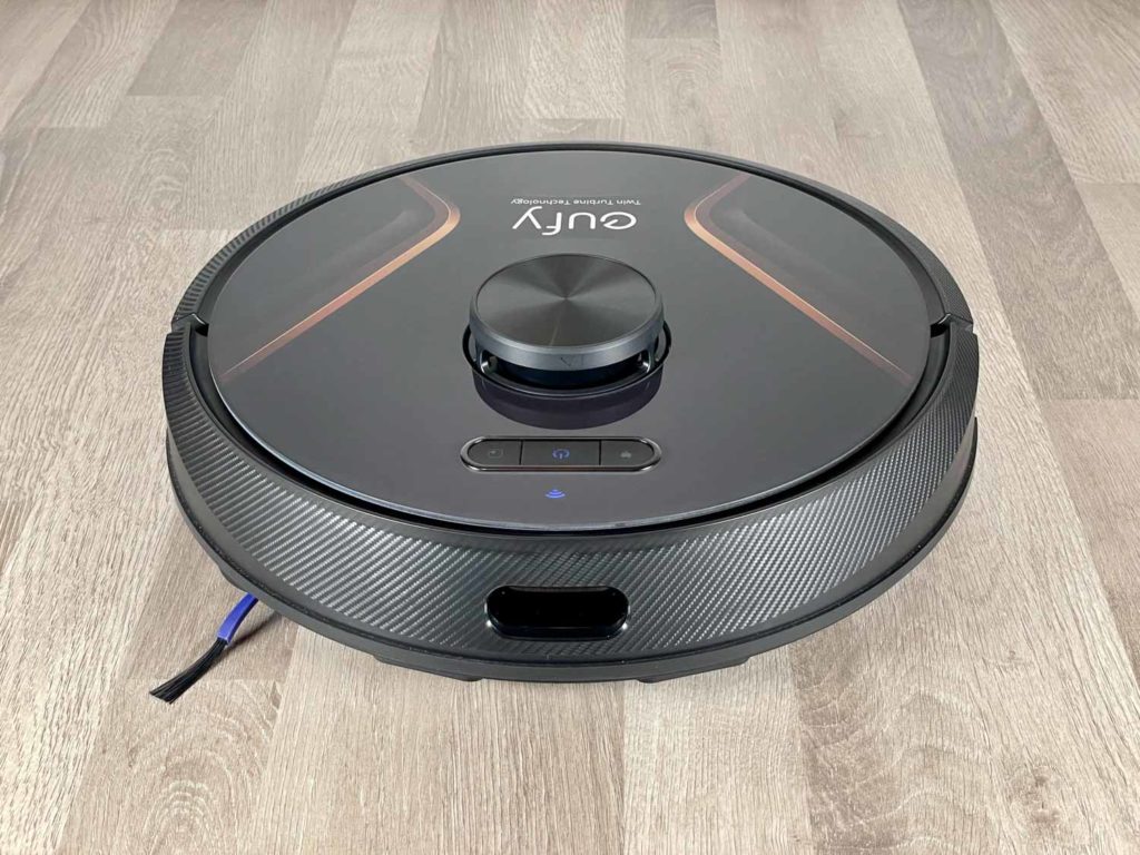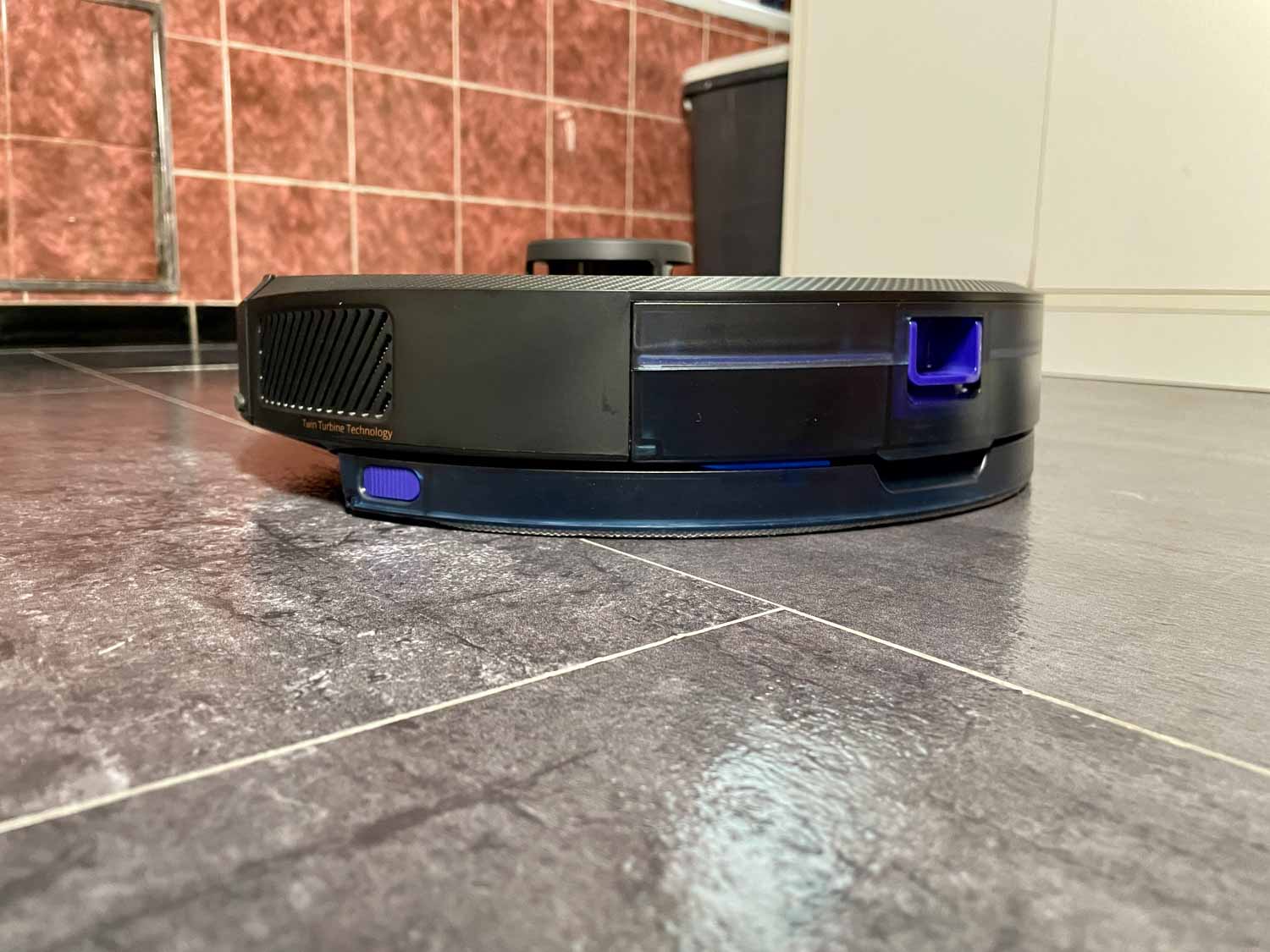 Auf der Vorderseite befindet sich der obligatorische Bumper, der mit einem Frontsensor und einem Wandsensor versehen ist. Zusätzlich ist auf dem Bumper, der eine Carbonoptik besitzt, eine Gummilippe aufgesetzt, die vor Schäden an Möbeln schützt. Seitlich befinden sich zwei Luftauslässe, die für die Abluft der zwei Turbinen zuständig sind. Am Heck erkennt man den eingesetzten Staubbehälter, der ohne großen Aufwand entnommen werden kann.