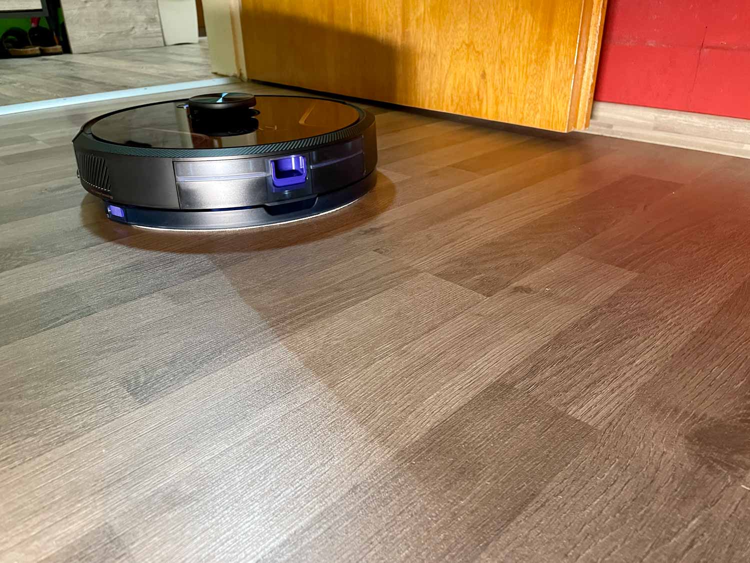 Hier muss ich sagen, bin ich etwas enttäuscht gewesen. Nicht weil die Wischleistung schlecht wäre, das ganz und gar nicht. Jedoch ist die Wischfunktion beim eufy RoboVac X8 Hybrid die einfachste Methode einer Wischfunktion, die es überhaupt gibt. Er zieht einen Wassertank während der Reinigung hinter sich her, der weder elektronisch steuerbar ist, noch eine Pumpe besitzt. Hier träufelt ganz gemächlich einfach nur Wasser aus kleinen Stofffiltern auf das Wischtuch. Das kontinuierlich und ohne Stopp. Das setzt voraus, dass man nach dem Wischvorgang dringend den Wassertank vom Roboter abzieht, da das Wasser auch auf der geparkten Position weiter ausläuft. Das Wischbild ist eigentlich durchgängig schön, jedoch etwas zu nass und nicht für jeden Bodentypen geeignet.
