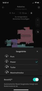 | BoostIQ | Die Teppicherkennung und dessen Saugkrafterhöhung kann aktiviert oder deaktiviert werden. |
