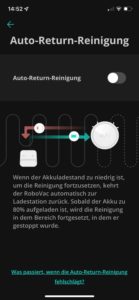 | Auto-Return | Der Roboter kann bei leerem Akku die Reinigung nach dem Aufladen wieder aufnehmen. |