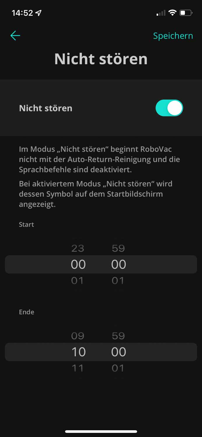 | Nicht Stören | Zu einem festgelegten Zeitraum, meistens nachts, kann der Roboter keine Reinigung wiederaufnehmen und gibt keine Sprachausgabe aus. |