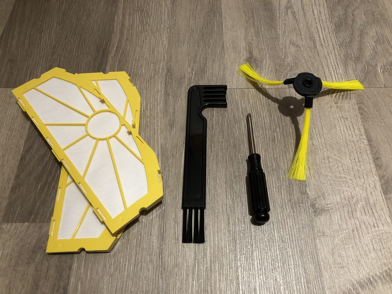 An den Wechsel der ersten Verschleißteile hat Kärcher gedacht und dem Roboter ein paar Ersatzteile beigelegt. Darunter befinden sich zwei zusätzliche Filter und eine weitere Seitenbürste. Ebenfalls ist ein praktisches Reinigungstool im Lieferumfang enthalten, dass für die Reinigung der Bürsten gedacht ist. Sogar ein Schraubenzieher wird mitgeliefert, um das heimische Werkzeug, für den Einbau der Seitenbürste durch eine Schraube, zu schonen.