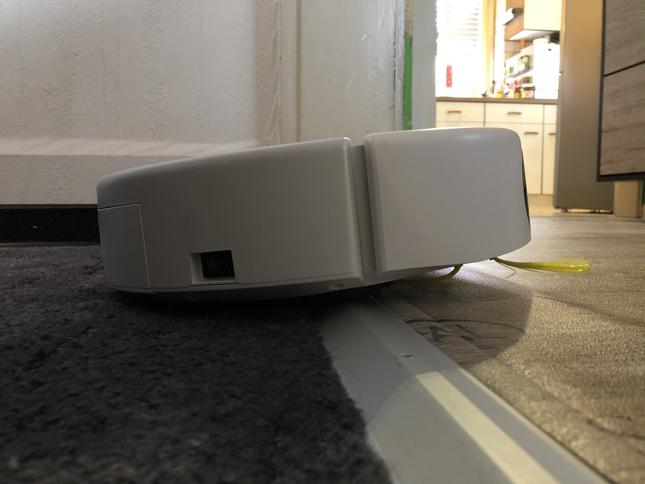 Im Test zeigte sich, dass der Roboter ein kleiner Kletterer ist. Harte Kanten werden mit bis zu 1,8 cm noch überwunden. Bei abgerundeten Kanten schafft er sogar deutlich mehr. Das ist, meiner Meinung nach, der Kraft des Roboters geschuldet. Er schiebt sich einfach die Kante herauf, ob der Bumper von der Höhe her nun im Weg ist oder nicht. Auch scheint mir der Schwerpunkt des Roboters nicht richtig austariert zu sein. Während der Reinigung und vor allem des vorherigen Umsehens, scheint der Roboter immer wieder nach hinten zu kippen. Plötzliche Stopps begünstigen das Kippen und so poltert es gelegentlich mal.