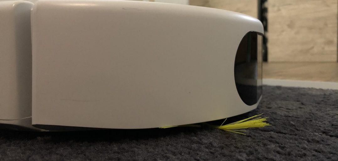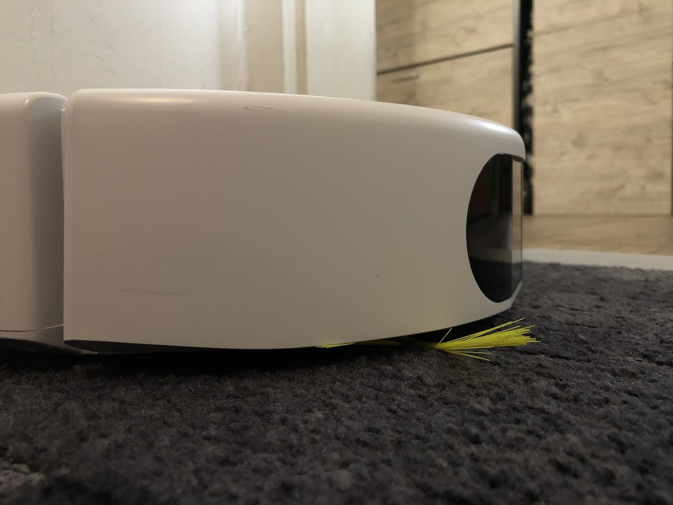 Wie schon erwähnt, könnte das Gerät gerne näher an den Rändern entlangfahren und auch die Seitenbürste hätte anders konstruiert werden können. Sie schimmert zwar sehr ansehnlich in Gelb seitlich am Roboter heraus, ist aber viel zu weich, um beispielsweise auf Teppichboden jeden Schmutz in Richtung Saugschacht zu fegen. Ab 1 cm Floorhöhe des Teppichbodens biegen sich die Seitenbürsten-Borsten sogar leicht in die Höhe. Ebenso ist das Wegschleudern von Schmutz bei diesem Gerät immer mal wieder das Thema. Zwar rotiert die Bürste gar nicht mal zu schnell, um diesen Vorgang zu begünstigen. Die Bürsten sind einfach zu lang und zu weich, biegen sich gerne mal, und schleudern beim Zurückbiegen alles Mögliche weg in irgendwelche anderen Ecken.