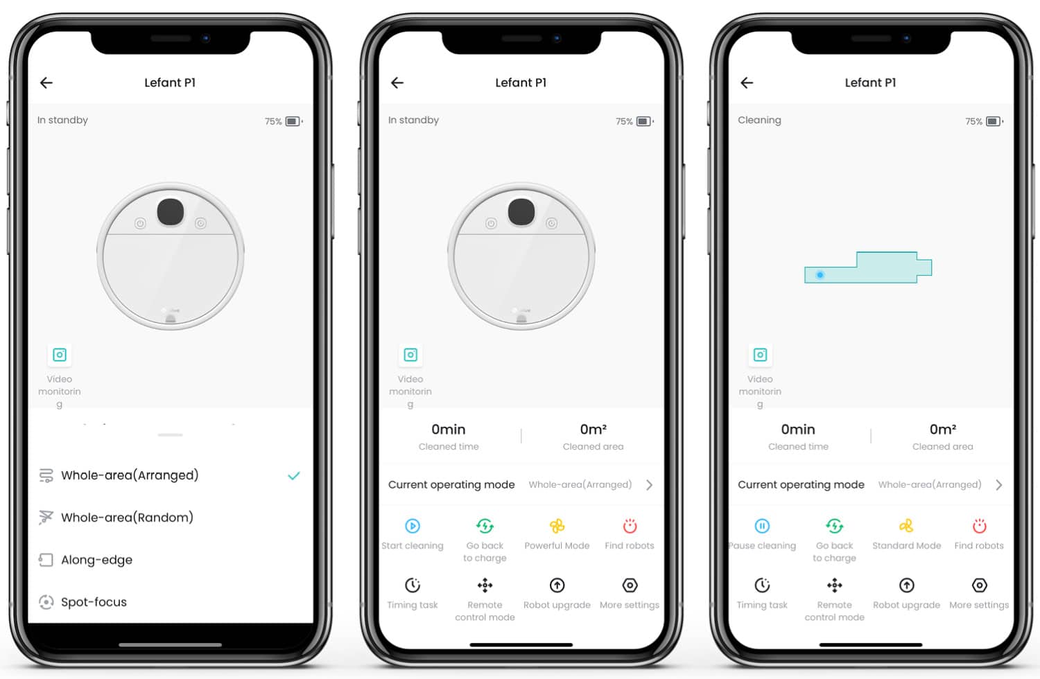 Der Lefant P1 hat jedoch noch weitere Navigations-Modis mit an Bord. Neben der angesprochenen geraden Bahnfahrt, kann der Sauger auch via Chaos-Navigation navigieren, eine alleinige Randreinigungsfahrt bewältigen oder in einen SpotClean-Modus überwechseln.