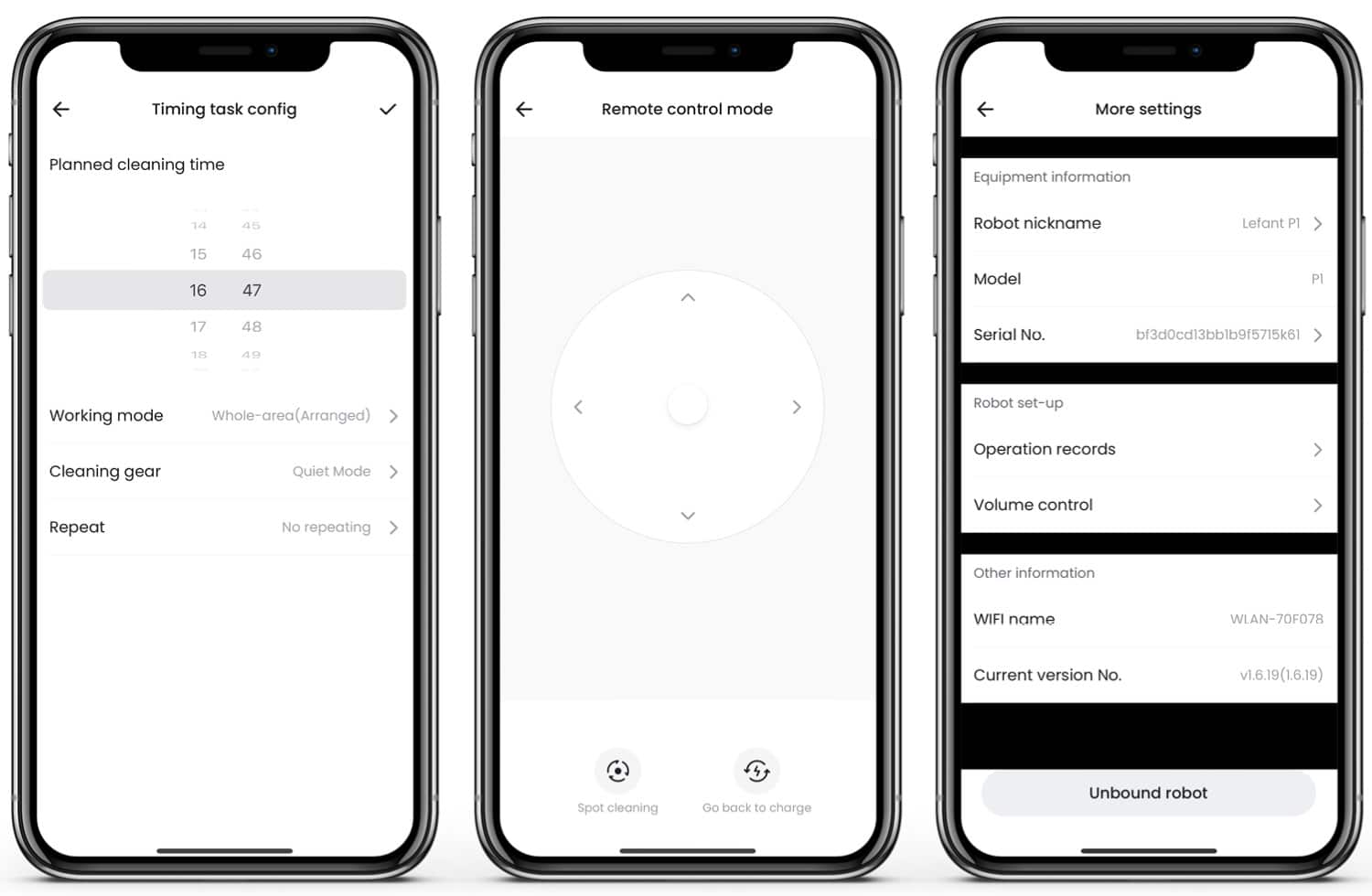 | Automatische Reinigung | Du kannst durch Programmierung eine Uhrzeit, einen Tag, eine Saugleistung und eine Navigationsmethode auswählen, und ihn so vollautomatisch von allein losschicken. |